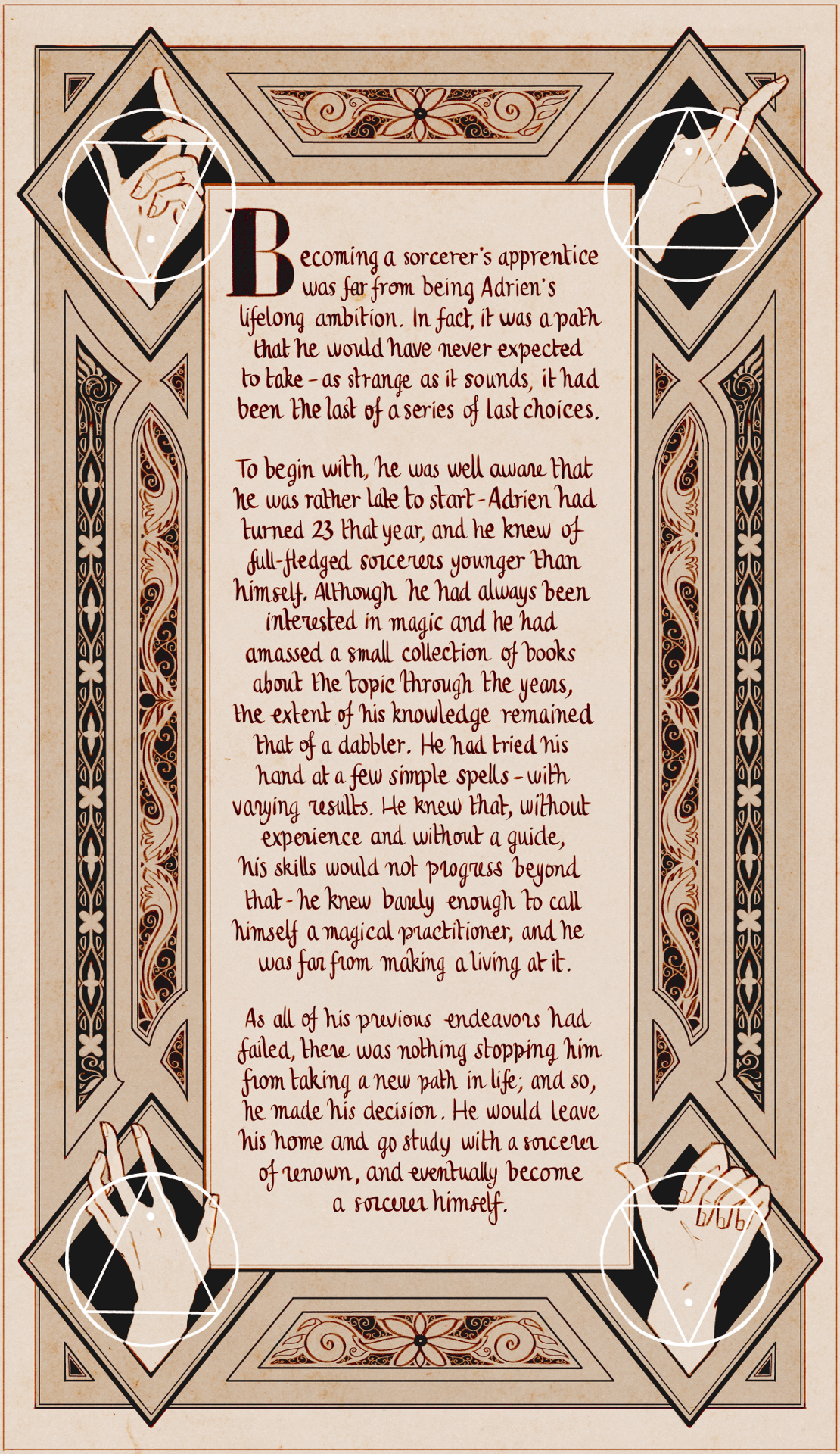 Becoming a sorcerer's apprentice was far from being Adrien's lifelong ambition. In fact, it was a path that he would have never expected to take - as strange as it sounds, it had been the last of a series of last choices. To begin with, he was well aware that he was rather late to start - Adrien had turned 23 that year, and he knew of full-fledged sorcerers younger than himself. Although he had always been interested in magic and he had amassed a small collection of books about the topic through the years, the extent of his knowledge remained that of a dabbler. He had tried his hand at a few simple spells - with varying results. He knew that, without experience and without a guide, his skills would not progress beyond that - he knew barely enough to call himself a magical practictioner, and he was far from making a living at it. As all of his previous endeavours had failed, there was nothing stopping him from taking a new path in life; and so, he made his decision. He would leave his home and go study with a sorcerer of renown, and eventually become a sorcerer himself.