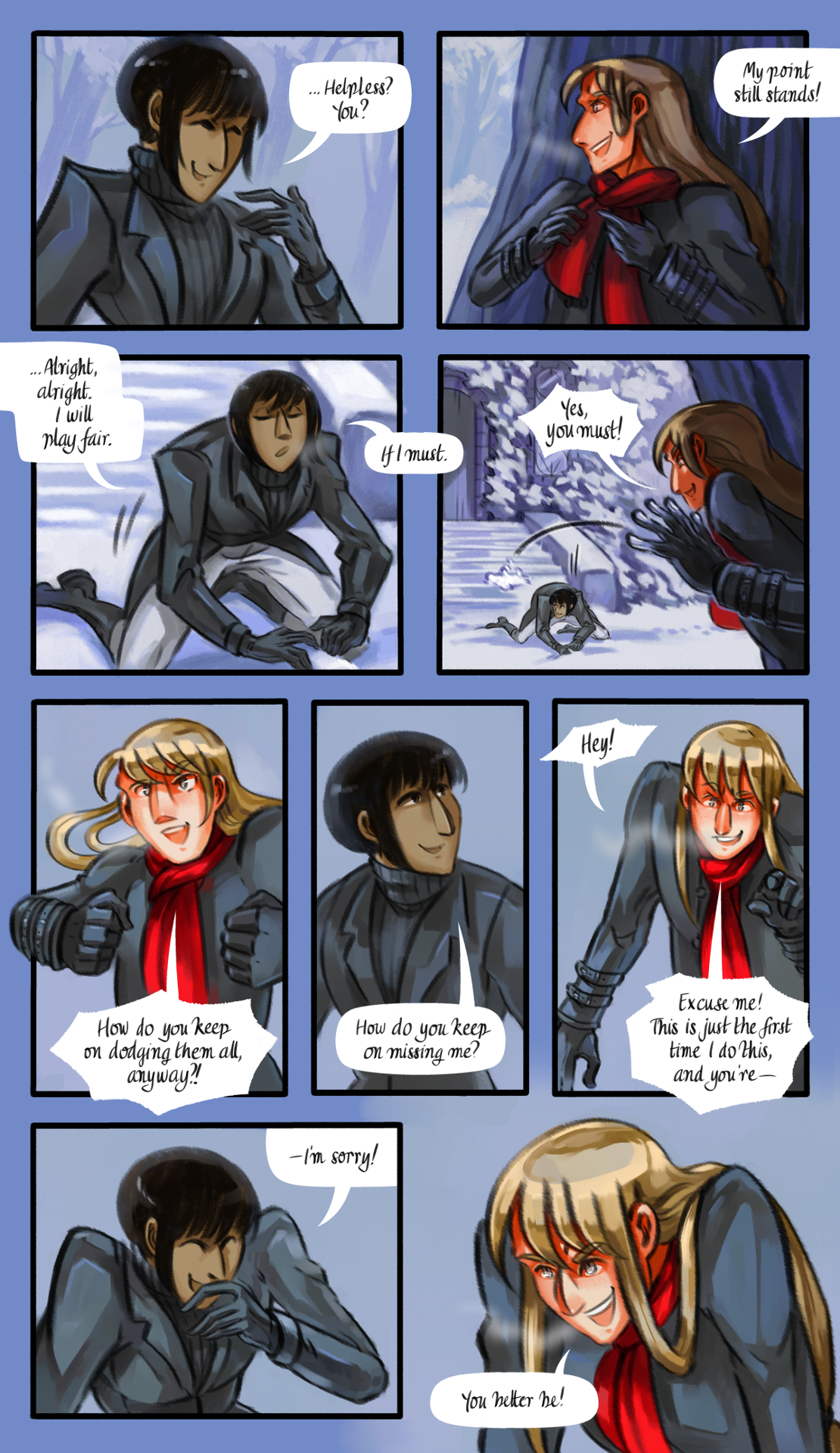 "Yes, you must!", Adrien said, reinforcing his point by throwing another snowball at him - Val ducked, and the snowball landed on the last step in front of the tower instead.