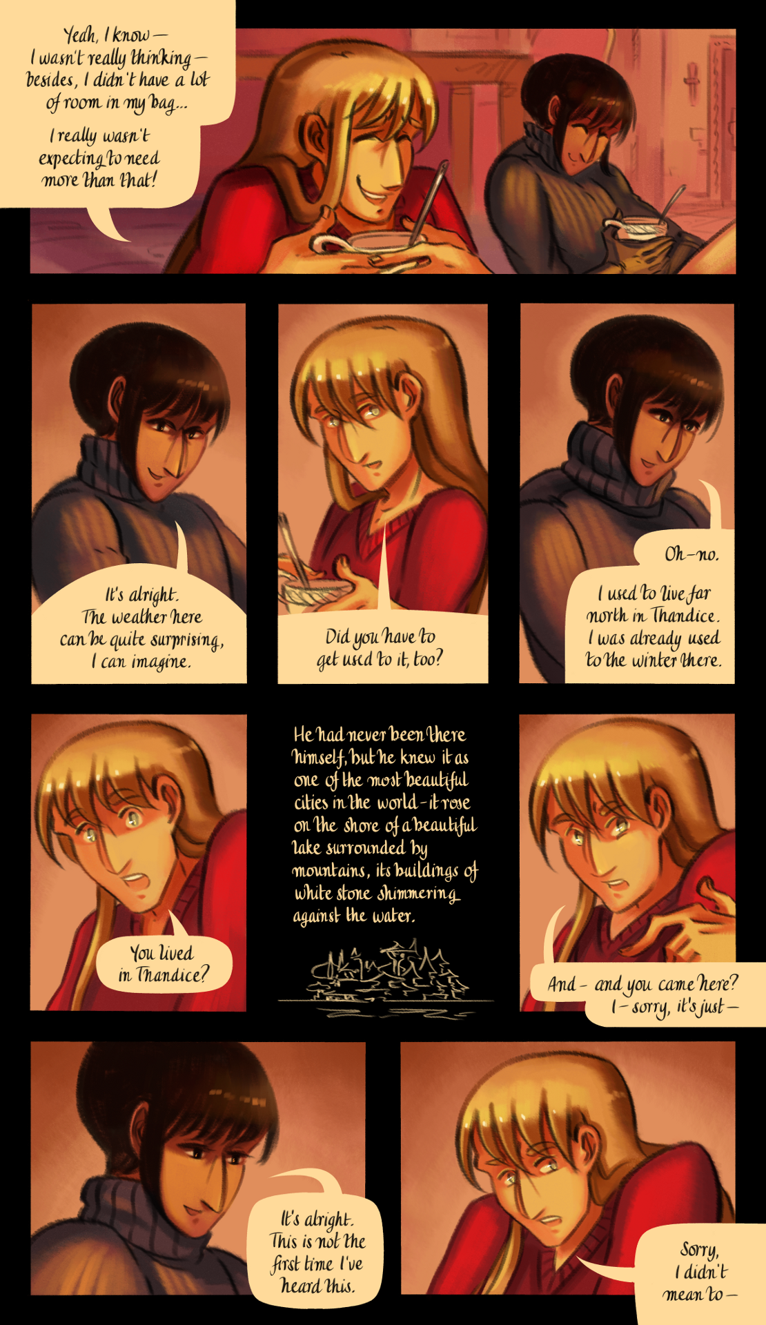 Now it was Adrien's turn to widen his eyes. "You lived in Thandice?", he gasped. He had never been there himself, but he knew it as one of the most beautiful cities in the world - it rose on the shore of a beautiful lake surrounded by mountains, its buildings of white stone shimmering against the water. "And -- and you came here?", Adrien said. Then he caught himself: "I -- sorry, it's just --".