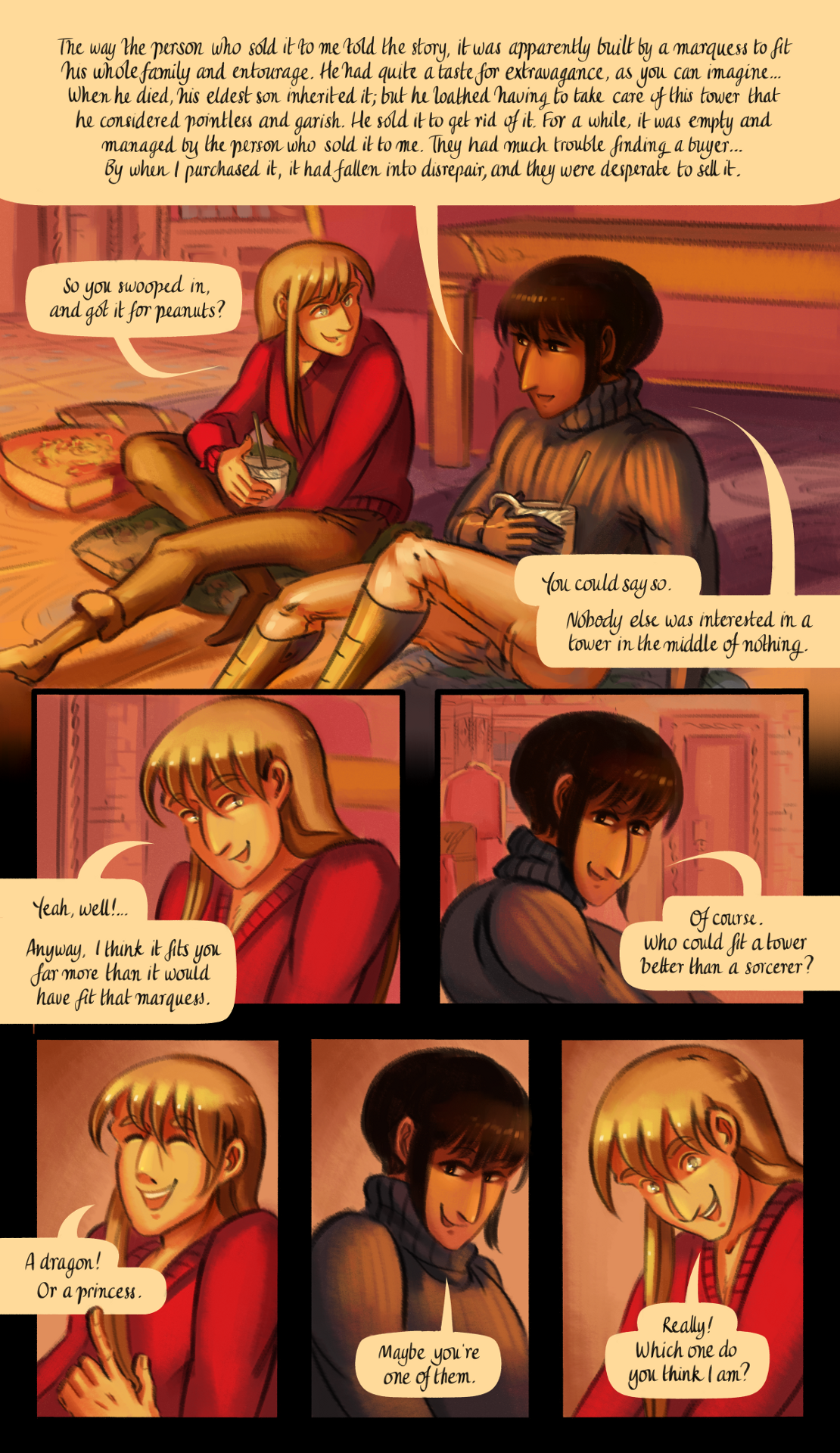 Val chuckled. "The way the person who sold it to me told the story, it was apparently built by a marquess to fit his whole family and entourage. He had quite a taste for extravagance, as you can imagine", he smiled. "When he died, his eldest son inherited it; but he loathed having to take care of this tower that he considered pointless and garish. He sold it to get rid of it. For a while, it was empty and managed by the person who sold it to me. They had much trouble finding a buyer... By when I purchased it, it had fallen in disrepair, and they were desperate to sell it".