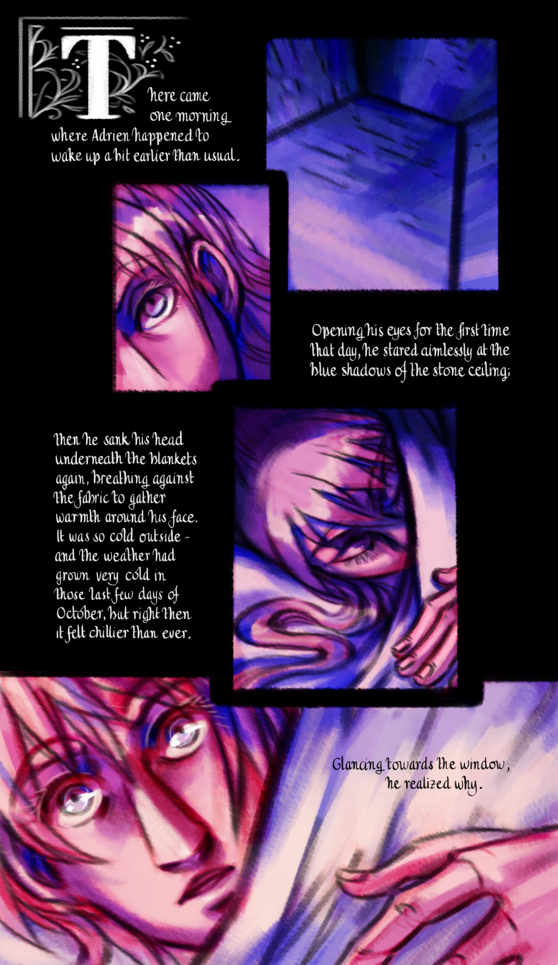 There came one morning where Adrien happened to wake up a bit earlier than usual. Opening his eyes for the first time that day, he stared aimlessly at the blue shadows of the stone ceiling; then he sank his head underneath the blankets again, breathing against the fabric to gather warmth around his face. It was so cold outside - and the weather had grown very cold in those last few days of October, but right then it felt chillier than ever.