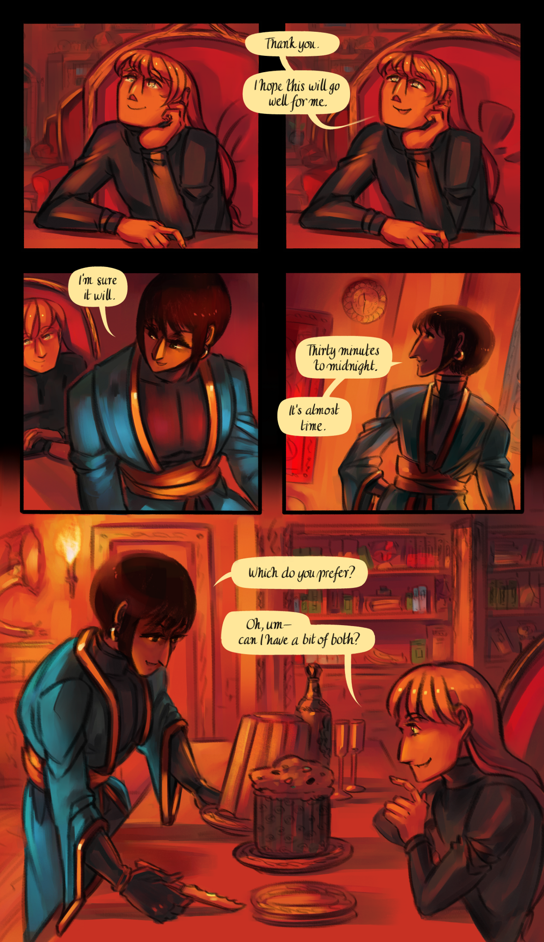 "I'm sure it will", Val smiled. He looked up at the clock. "Thirty minutes to midnight", he read. "It's almost time". Val gestured with his hand, and set the table with panettone, pandoro, and a bottle of spumante. He unpacked both cakes and picked up a knife to slice them: "Which do you prefer?".