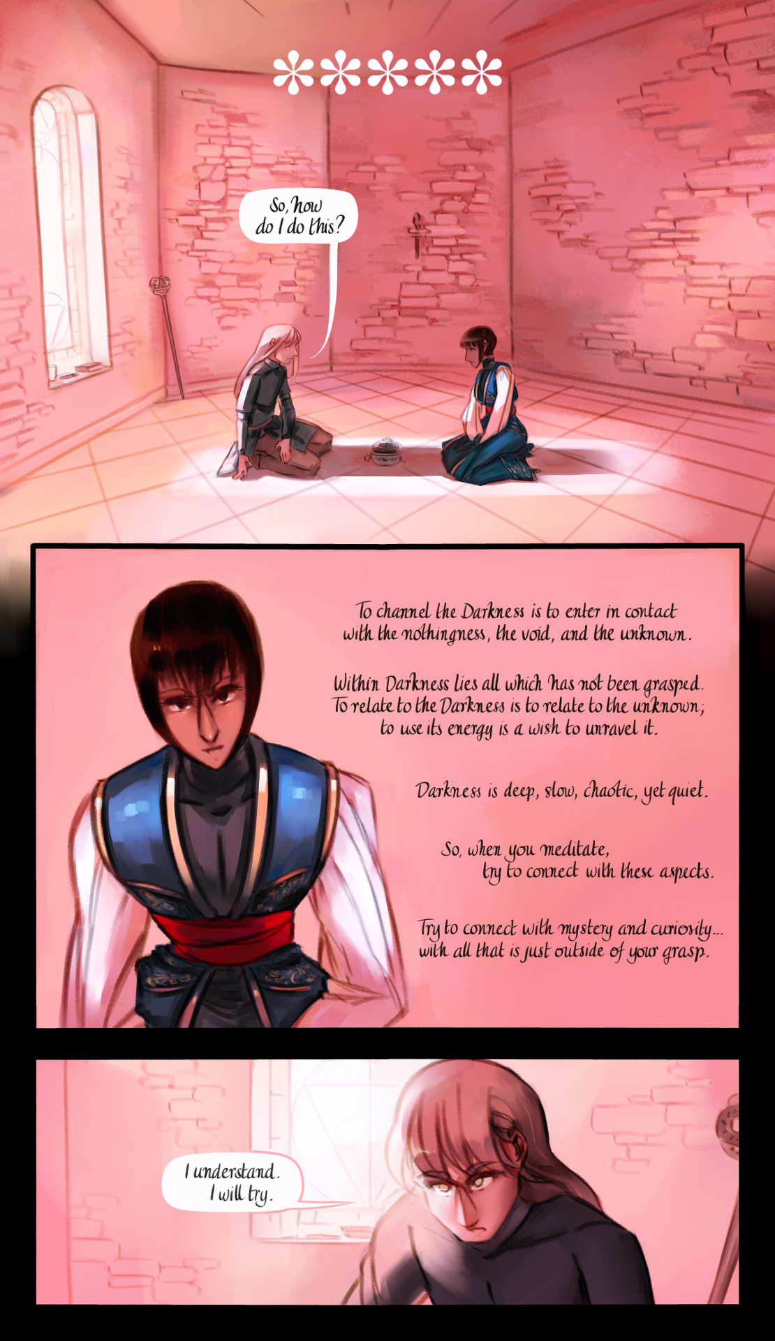 "To channel the Darkness is to enter in contact with the nothingness, the void, and the unknown", Val started. "Within Darkness lies all which has not been grasped. To relate to the Darkness is to relate to the unknown; to use its energy is a wish to unravel it. Darkness is deep, slow, chaotic, yet quiet. So, when you meditate, try to connect with these aspects. Try to connect with mystery and curiosity... with all that is just outside of your grasp".