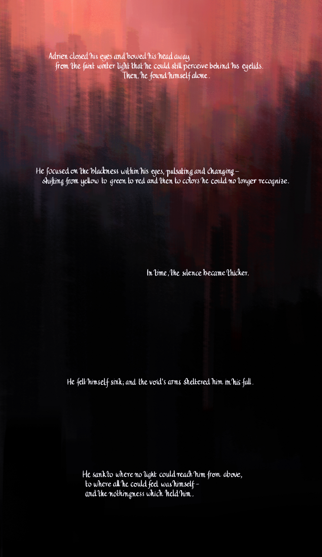 He focused on the blackness within his eyes, pulsating and changing - shifting from yellow to green to red and then to colors he could no longer recognize. In time, the silence became thicker. He felt himself sink; and the void's arms sheltered him in his fall. He sank to where no light could reach him from above, to where all he could feel was himself - and the nothingness which held him.