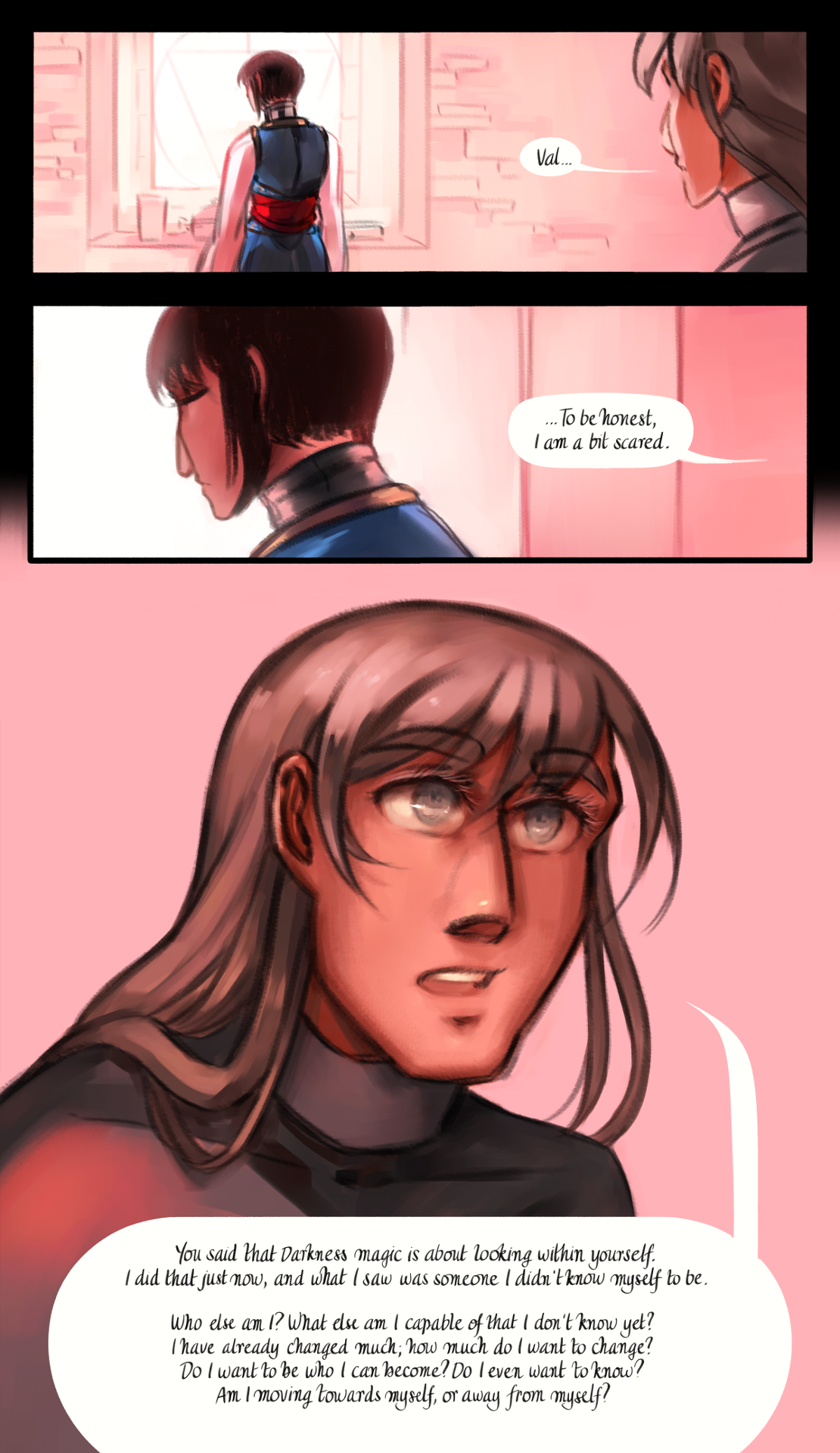 "You said that Darkness magic is about looking within yourself", Adrien said. "I did that just now, and what I saw was someone I didn't know myself to be". Adrien's eyes lost focus over the uneven texture of the stone walls. "Who else am I? What else am I capable of that I don't know yet? I have already changed much; how much do I want to change? Do I want to be who I can become? Do I even want to know? Am I moving towards myself, or away from myself?".