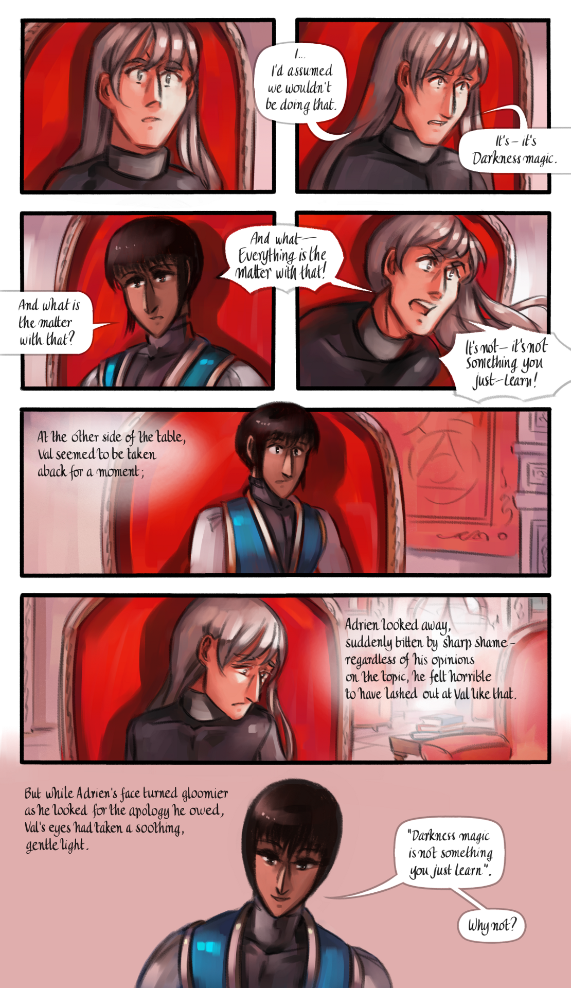 At the other side of the table, Val seemed to be taken aback for a moment; Adrien looked away, suddenly bitten by sharp shame - regardless of his opinions on the topic, he felt horrible to have lashed out at Val like that. But while Adrien's face turned gloomier as he looked for the apology he owed, Val's eyes had taken a soothing, gentle light. "Darkness magic is not something you just learn", he echoed, weighing each word. "Why not?".