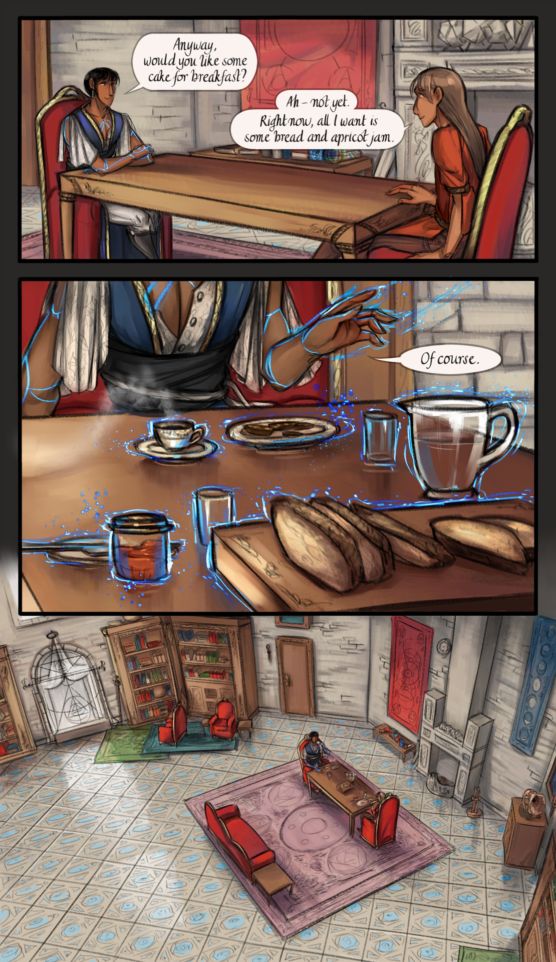 "Of course", Val grinned. A twitch of his fingers, and the table was set. For himself, he'd magicked up a cup of coffee with chocolate biscuits; he picked up one biscuit, and dunked it into the coffee.