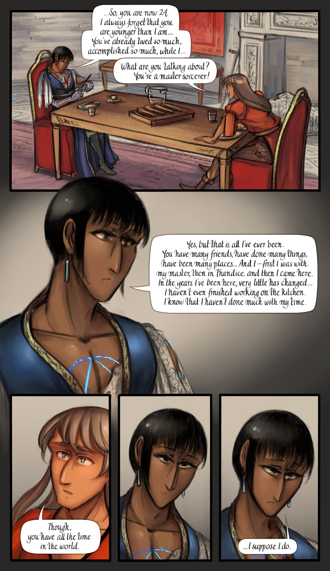 "Yes, but that is all I've ever been", he replied, his voice low. "You have many friends, have done many things, have been many places... And I -- first I was with my master, then in Thandice, and then I came here. In the years I've been here, very little has changed... I haven't even finished working on the kitchen. I know that I haven't done much with my time".