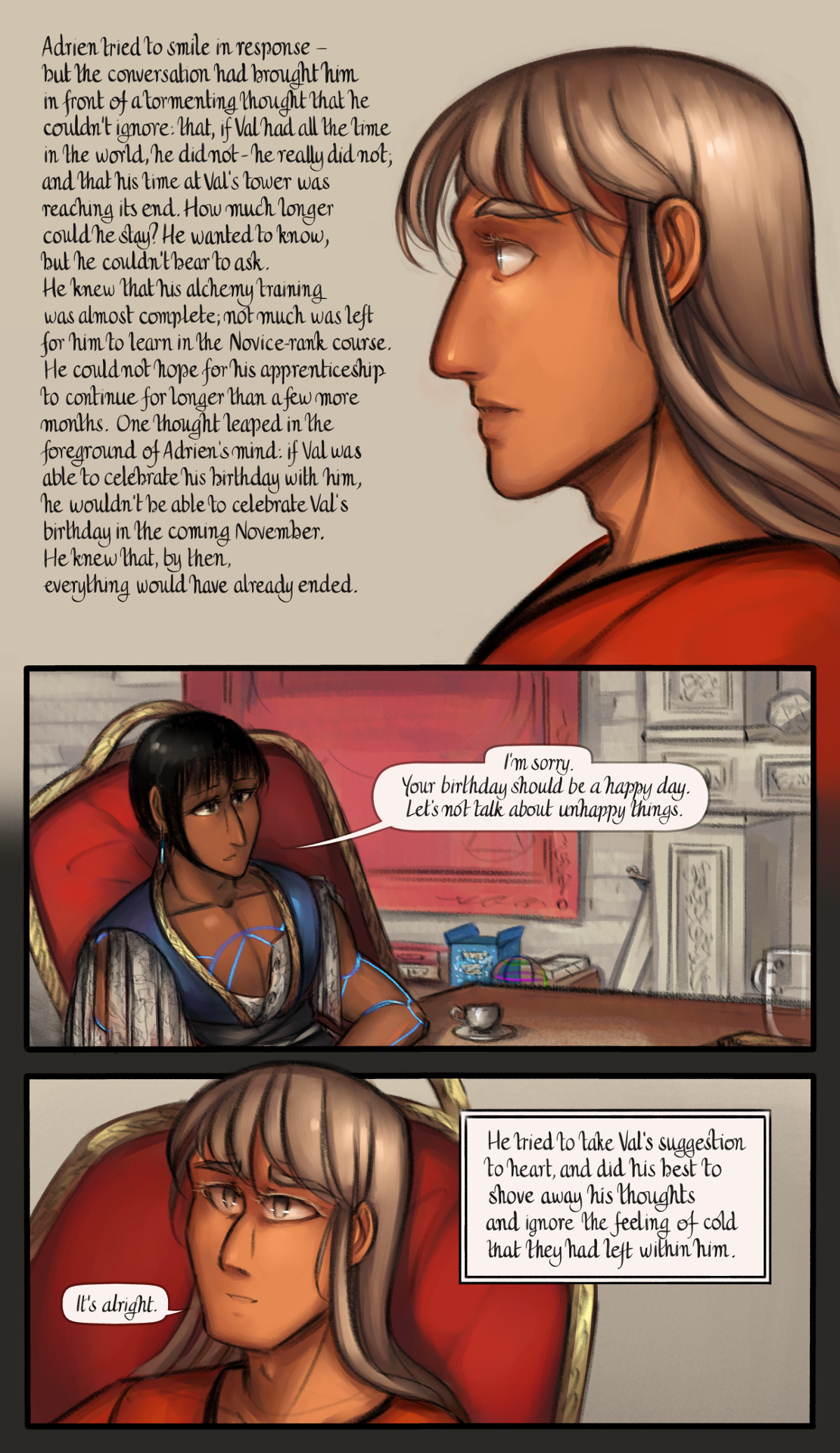 Adrien tried to smile in response - but the conversation had brought him in front of a tormenting thought that he couldn't ignore: that, if Val had all the time in the world, he did not - he really did not; and that his time at Val's tower was reaching its end. How much longer could he stay? He wanted to know, but he couldn't bear to ask. He knew that his alchemy training was almost complete; not much was left for him to learn in the Novice-rank course. He could not hope for his apprenticeship to continue for longer than a few more months. One thought leaped in the foreground of Adrien's mind: if Val was able to celebrate his birthday with him, he wouldn't be able to celebrate Val's birthday in the coming November. He knew that, by then, everything would have already ended.