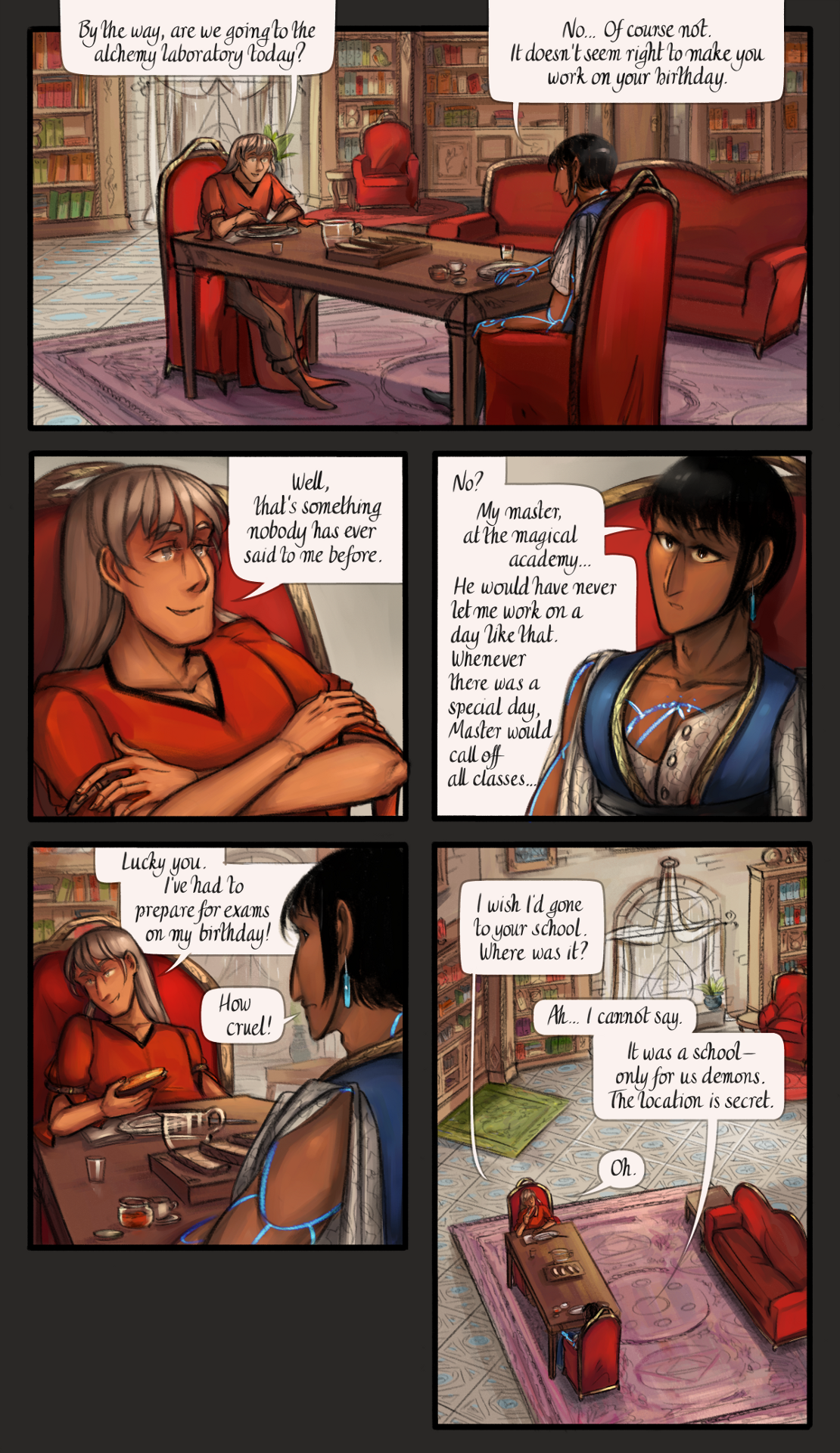 "No?", Val said, tilting his face. The pattern of light that peeked from his neckline flared up. "My master, at the magical academy... He would have never let me work on a day like that. Whenever there was a special day, Master would call off all classes...".