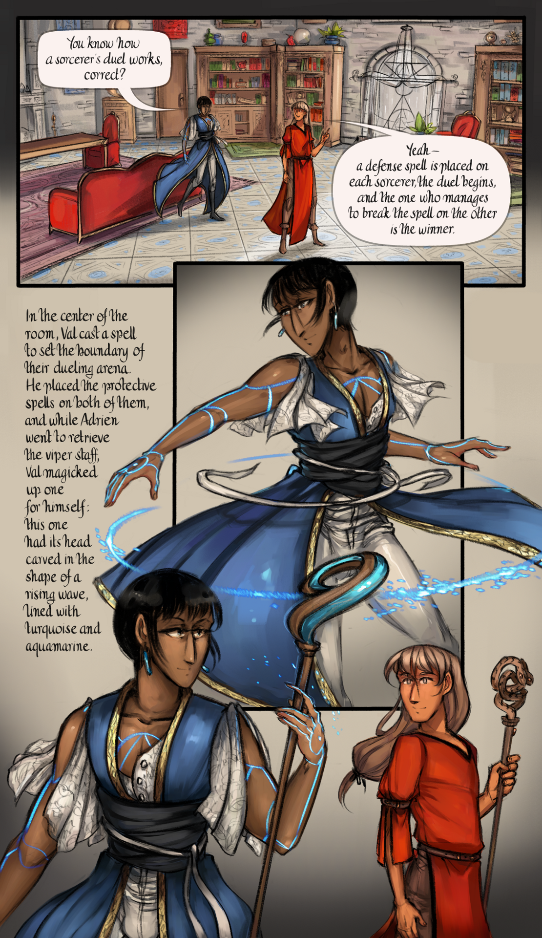 In the center of the room, Val cast a spell to set the boundary of their dueling arena. He placed the protective spells on both of them, and while Adrien went to retrieve the viper staff, Val magicked up one for himself: this one had its head carved in the shape of a rising wave, lined with turquoise and aquamarine.