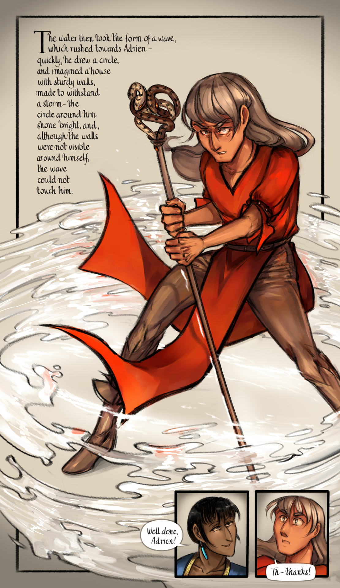 The water then took the form of a wave, which rushed towards Adrien - quickly, he drew a circle, and imagined a house with sturdy walls, made to withstand a storm - the circle around him shone bright, and, although the walls were not visible around himself, the wave could not touch him.