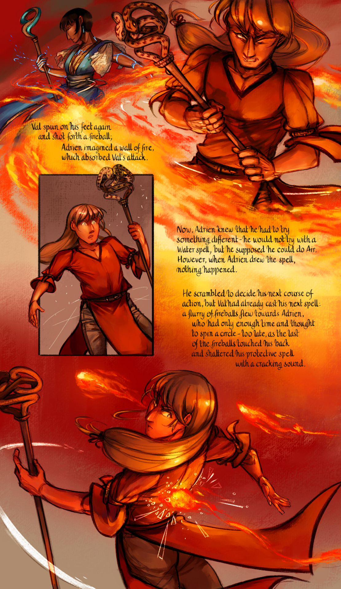Val spun on his feet again and shot forth a fireball; Adrien imagined a wall of fire, which absorbed Val's attack. Now, Adrien knew that he had to try something different - he would not try with a Water spell, but he supposed he could do Air. However, when Adrien drew the spell, nothing happened. He scrambled to decide his next course of action, but Val had already cast his next spell: a flurry of fireballs flew towards Adrien, who had only enough time and thought to spin a circle - too late, as the last of the fireballs touched his back and shattered his protective spell with a cracking sound.