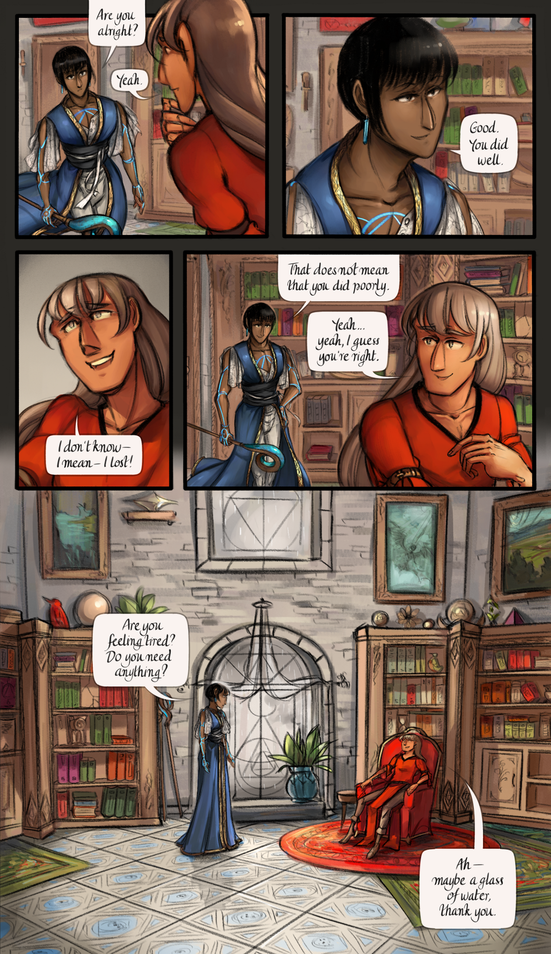 Adrien tilted his head. "Yeah... yeah, I guess you're right". He walked towards one of the windows; he propped the staff between the window seat and a bookshelf, and sat down on one of the armchairs nearby. Outside, it was still raining. Val placed his staff next to Adrien's and seated himself in front of the window. "Are you feeling tired? Do you need anything?".