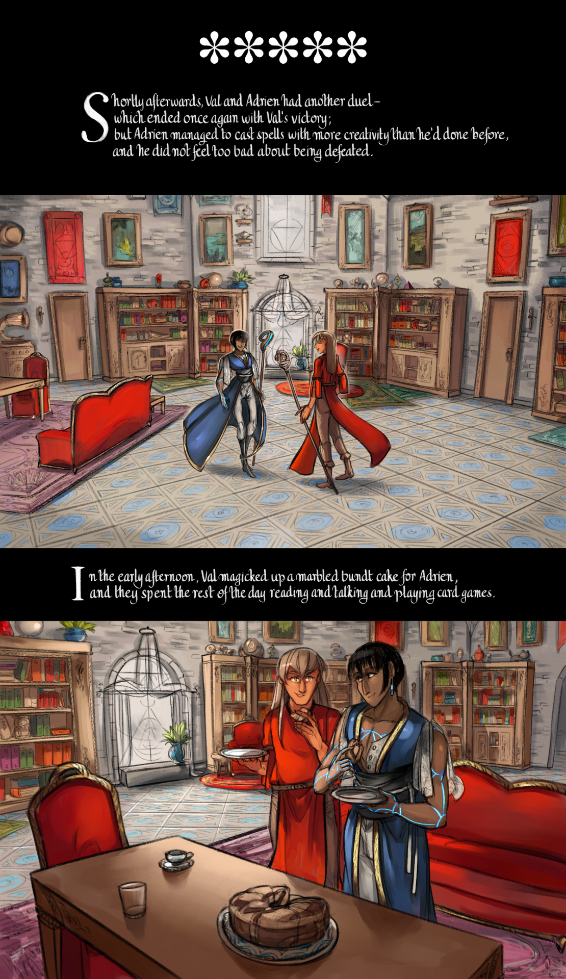 Shortly afterwards, Val and Adrien had another duel - which ended once again with Val's victory; but Adrien managed to cast spells with more creativity than he'd done before, and he did not feel too bad about being defeated. In the early afternoon, Val magicked up a marbled bundt cake for Adrien, and they spent the day reading and talking and playing card games.
