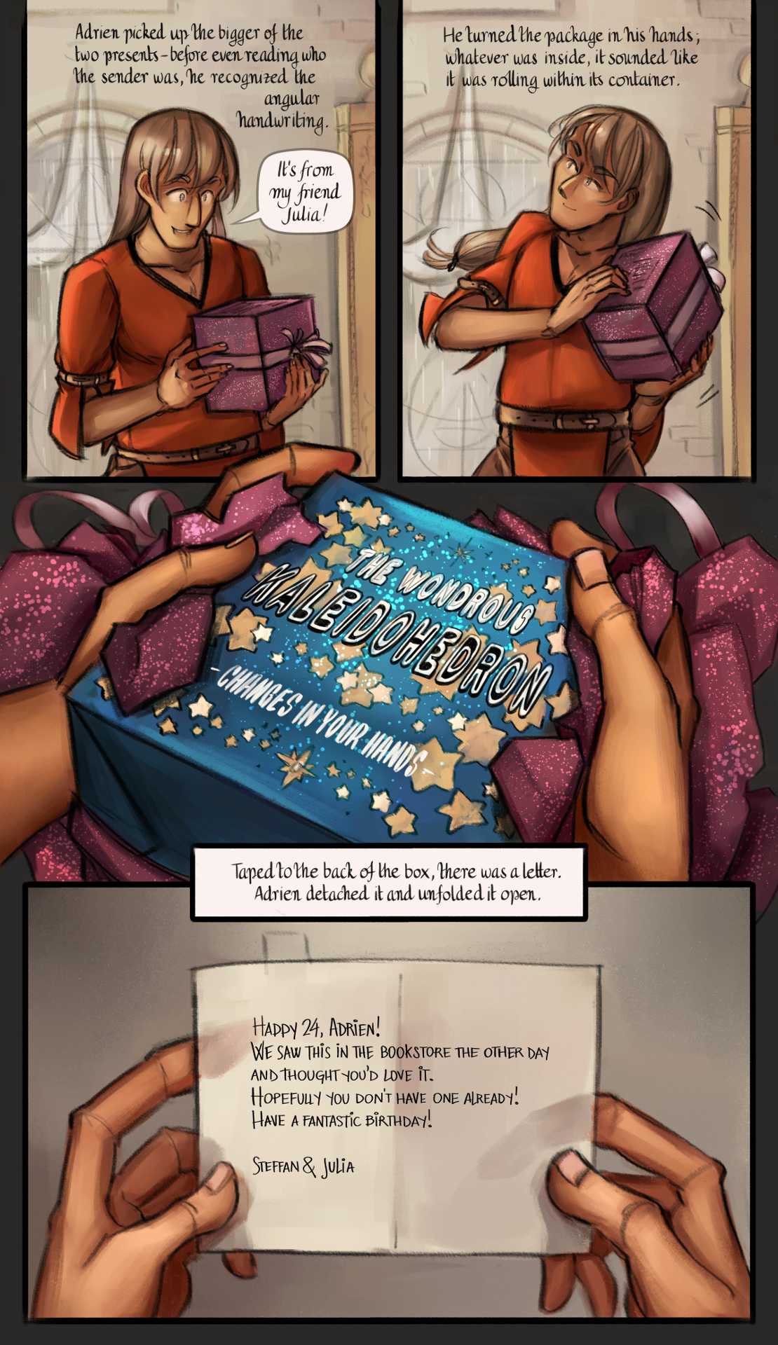 Also about the name of the kaleidohedron: back in high school, the teachers said that knowing ancient Latin and ancient Greek would be good for me. I was highly skeptical. But there have been a few days in which my vast repertoire of knowing random shit has paid off. Today is one such day. But I don't think "naming a magical toy in a webcomic about gay wizards" is exactly what they meant.