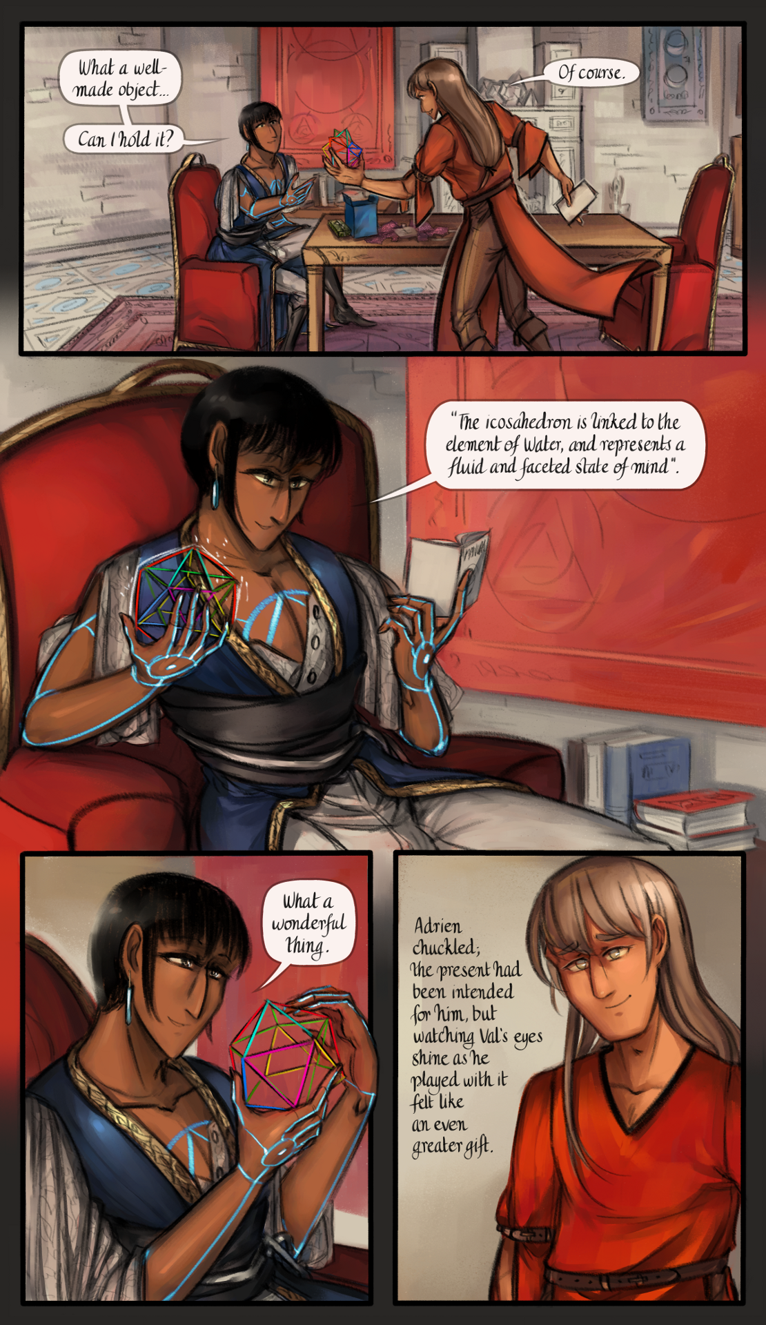 "Of course", Adrien said, and passed him the kaleidrohedron and the booklet. The blue patterns on Val's fingers flared up; in his hand, the shape morphed into an icosahedron. Val read from the manual: "The icosahedron is linked to the element of Water, and represents a fluid and faceted state of mind".