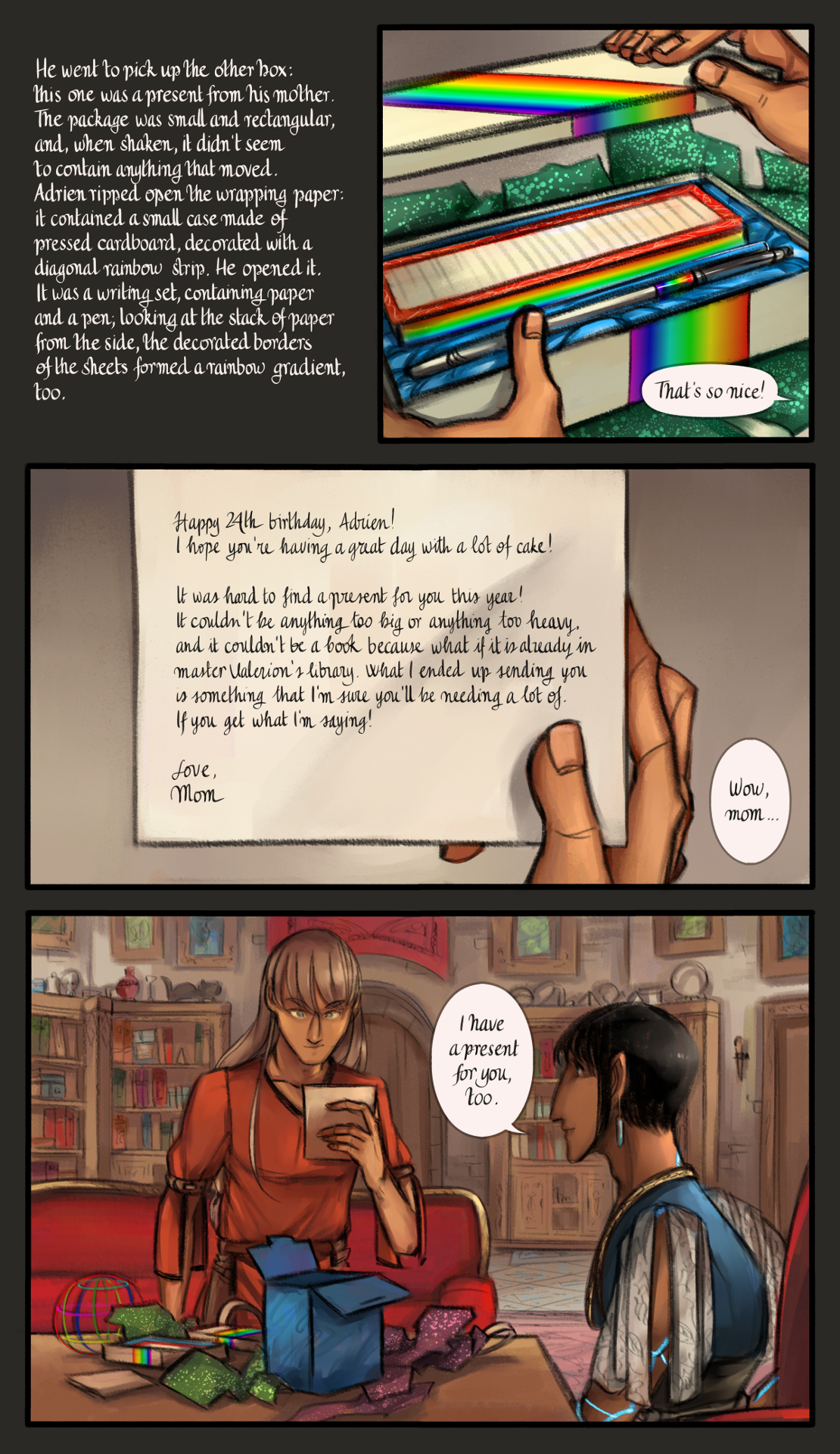 He went to pick up the other box: this one was a present from his mother. The package was small and rectangular, and, when shaken, it didn't seem to contain anything that moved. Adrien ripped open the wrapping paper: it contained a small case made of pressed cardboard, decorated with a diagonal rainbow strip. He opened it. It was a writing set, containing paper and a pen; looking at the stack of paper from the side, the decorated borders of the sheets formed a rainbow gradient, too. "That's so nice", he commented, excited. He unfolded his mother's letter: