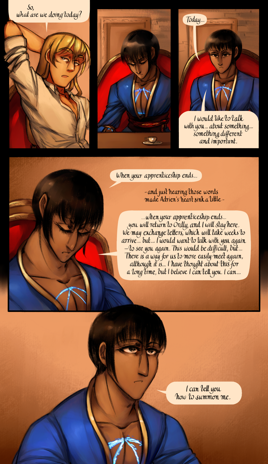 Val lowered his head. A few seconds passed before he could answer. "Today", Val said, "I would like to talk with you... about something... something different and important". The deep neckline of his robe revealed an odd pulse in the blue markings on his chest. "When your apprenticeship ends", Val then said - and just hearing those words made Adrien's heart sink a little - "when your apprenticeship ends... you will return to Ordly, and I will stay here. We may exchange letters, which will take weeks to arrive... but... I would want to talk with you again -- to see you again. This would be difficult, but... There is a way for us to more easily meet again, although it is... I have thought about this for a long time, but I believe I can tell you. I can... I can tell you how to summon me".