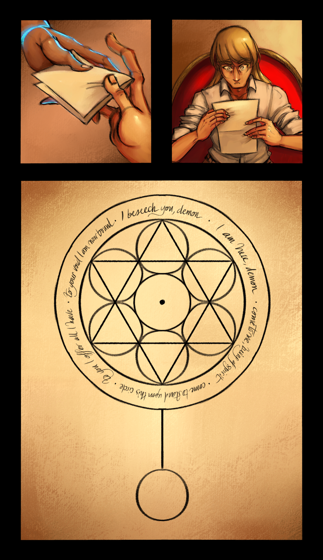 The page bore a pen drawing of an intricate, gorgeous, terrifying magic circle. It was made out of two circles, one larger and one smaller, connected to each other by a straight line; the smaller circle was plain and unadorned, and the larger one was anything but - within it, six circles and six triangles forming the symbols for the elements were arranged in a six-pointed star around a seventh circle, which had a dot in the middle. The inner border of the larger circle was inscribed with the incantation: