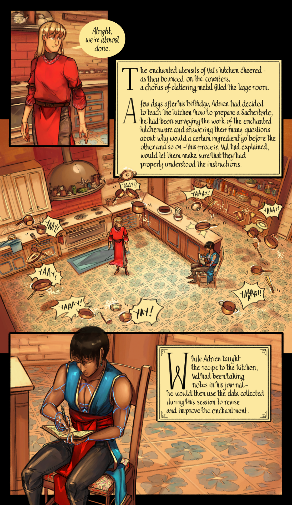 The enchanted utensils of Val's kitchen cheered - as they bounced on the counters, a chorus of clattering metal filled the large room. A few days after his birthday, Adrien had decided to teach the kitchen how to prepare a Sachertorte; he had been surveying the work of the enchanted kitchenware and answering their many questions about why would a certain ingredient go before the other and so on - this process, Val had explained, would let them make sure that they had properly understood the instructions. While Adrien taught the recipe to the kitchen, Val had been taking notes in his journal - he would then use the data collected during this session to revise and improve the enchantment.