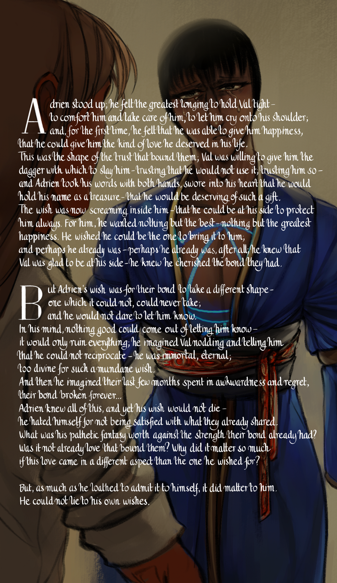 Adrien stood up; he felt the greatest longing to hold Val tight - to comfort him and take care of him, to let him cry onto his shoulder; and, for the first time, he felt that he was able to give him happiness, that he could give him the kind of love he deserved in his life. This was the shape of the trust that bound them; Val was willing to give him the dagger with which to slay him - trusting that he would not use it; trusting him so - and Adrien took his words with both hands, swore into his heart that he would hold his name as a treasure - that he would be deserving of such a gift. The wish was now screaming inside him - that he could be at his side to protect him always. For him, he wanted nothing but the best - nothing but the greatest happiness. He wished he could be the one to bring it to him; and perhaps he already was - perhaps he already was, after all; he knew that Val was glad to be at his side - he knew he cherished he bond they had. But Adrien's wish was for their bond to take a different shape - one which it could not, could never take; and he would not dare to let him know. In his mind, nothing good could come out of letting him know - it would only ruin everything; he imagined Val nodding and telling him that he could not reciprocate - he was immortal, eternal; too divine for such a mundane wish. And then he imagined their last few months spent in awkwardness and regret, their bond broken forever... Adrien knew all of this, and yet his wish would not die - he hated himself for not being satisfied with what they already shared. What was his pathetic fantasy worth against the strength their bond already had? Was it not already love that bound them? Why did it matter so much if this love came in a different aspect than the one he wished for? But, as much as he loathed to admit it to himself, it did matter to him. He could not lie to his own wishes.
