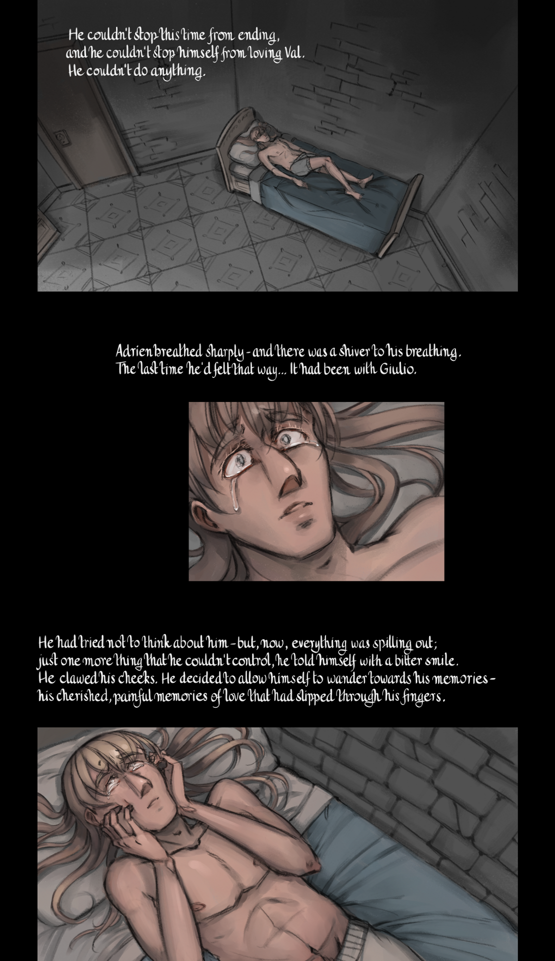 He had tried not to think about him - but, now, everything was spilling out; just one more thing that he couldn't control, he told himself with a bitter smile. He clawed his cheeks. He decided to allow himself to wander towards his memories - his cherished, painful memories of love that had slipped through his fingers.