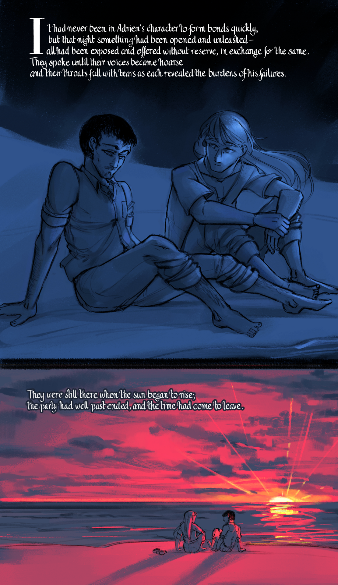 It had never been in Adrien's character to form bonds quickly, but that night something had been opened and unleashed - all had been exposed and offered without reserve, in exchange for the same. They spoke until their voices became hoarse and their throats full with tears as each revealed the burdens of his failures. They were still there when the sun began to rise; the party had well past ended, and the time had come to leave.