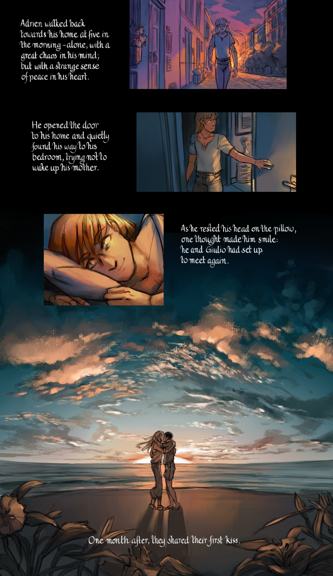 Adrien walked back towards his home at five in the morning - alone, with a great chaos in his mind; but with a strange sense of peace in his heart. He opened the door to his home and quietly found his way to his bedroom, trying not to wake up his mother.