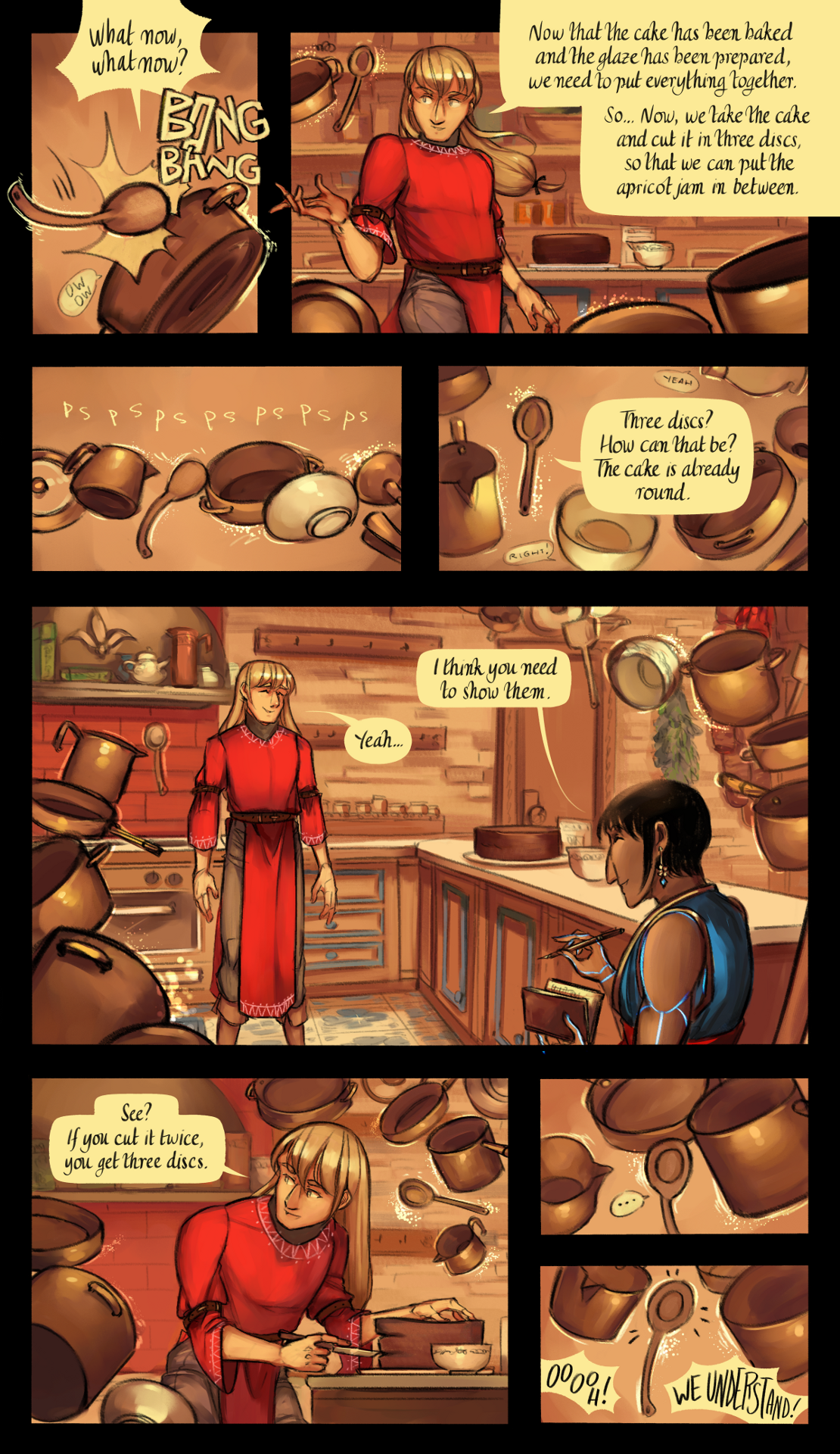 A murmur snaked through the kitchenware. "Three discs? How can that be? The cake is already round", the spoon said.