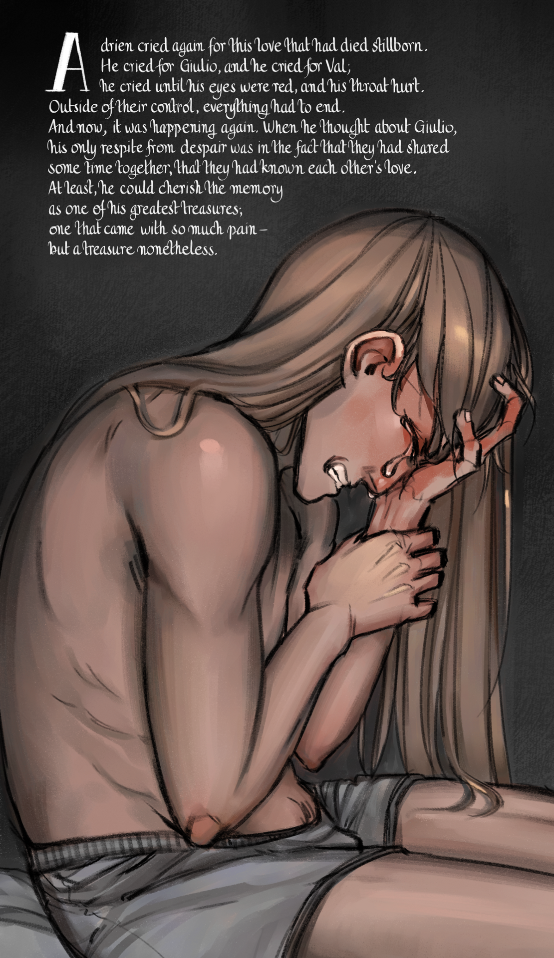 Adrien cried again for this love that had died stillborn. He cried for Giulio, and he cried for Val; he cried until his eyes were red, and his throat hurt. Outside of their control, everything had to end. And now, it was happening again. When he thought about Giulio, his only respite from despair was in the fact that they had shared some time together, that they had known each other's love. At least, he could cherish the memory as one of his greatest treasures; one that came with so much pain - but a treasure nonetheless.