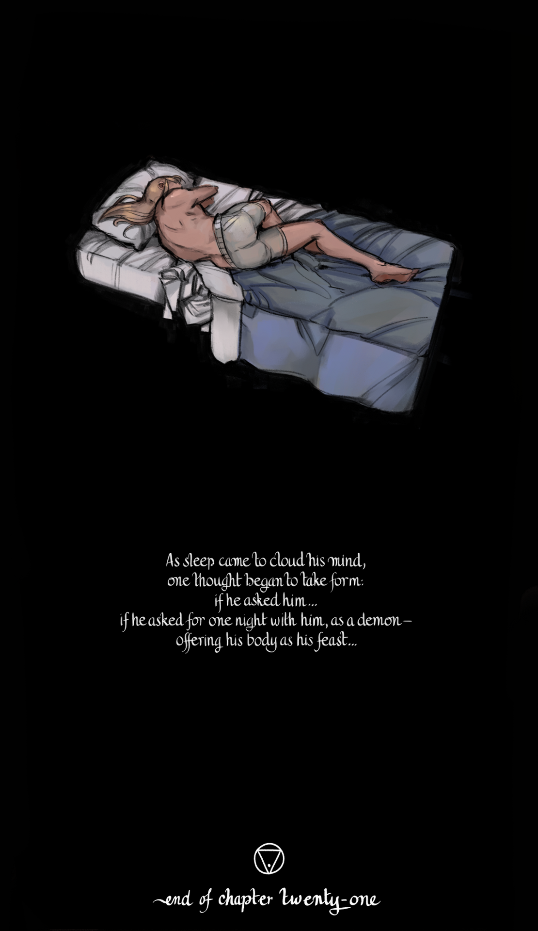 Next chapter's title is "All memories are dead things". It is certainly not any more cheerful, as you can tell. It does however contain some of my most favorite writing work in absolute, which I am proud to finally unveil.