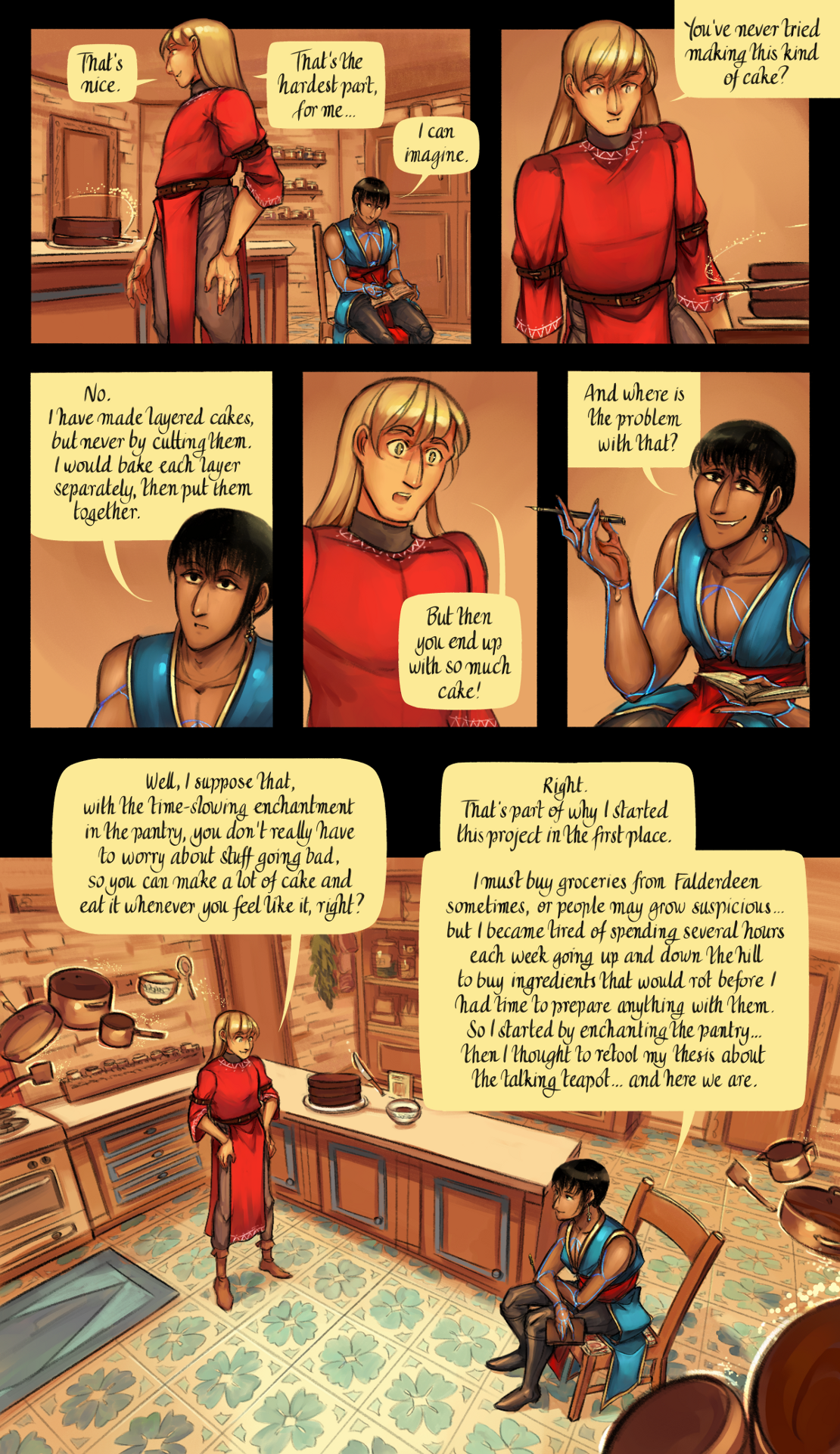 "Right. That's part of why I started this project in the first place", Val replied. "I must buy groceries from Falderdeen sometimes, or people may grow suspicious... but I became tired of spending several hours each week going up and down the hill to buy ingredients that would rot before I had time to prepare anything with them. So I started by enchanting the pantry... then I thought to retool my thesis about the talking teapot... and here we are".