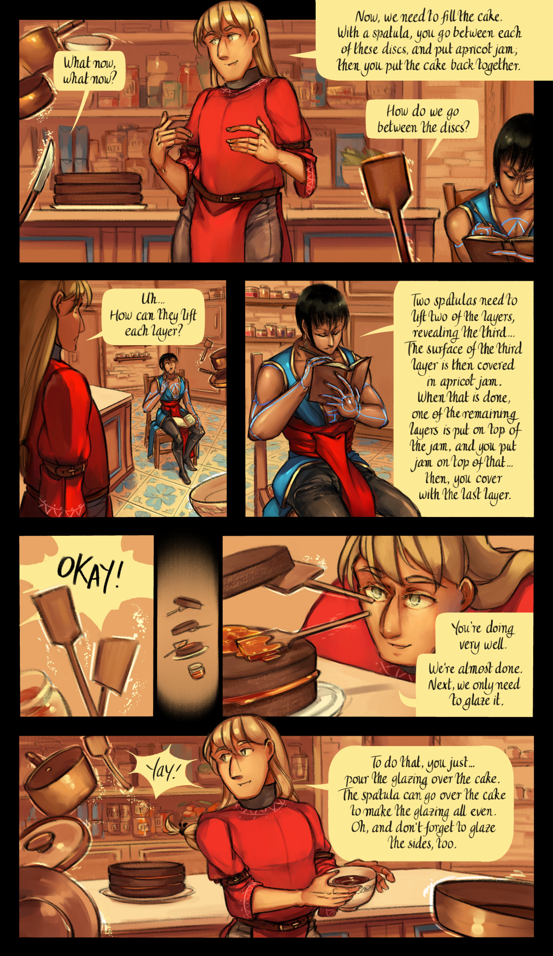 "Okay!", the kitchenware replied, and scurried over to do as Val had instructed them - Adrien smiled as he watched the spatula slather the jam on the cake. "You're doing very well", he said. "We're almost done. Next, we only need to glaze it".