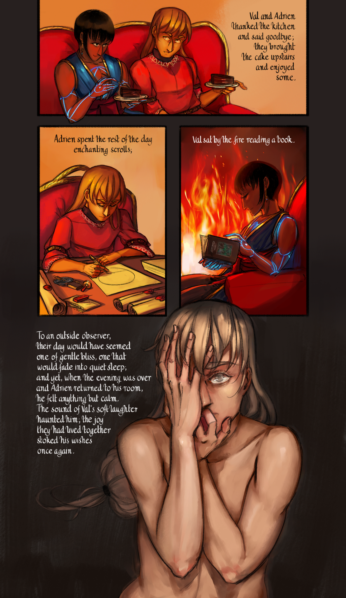 When they were done cooking, Val and Adrien thanked the kitchen and said goodbye; they brought the cake upstairs and enjoyed some. Adrien spent the rest of the day enchanting scrolls; Val sat by the fire reading a book. To an outside observer, their day would have seemed one of gentle bliss, one that would fade into quiet sleep; and yet, when the evening was over and Adrien returned to his room, he felt anything but calm. The sound of Val's soft laughter kept haunting him; the joy they had lived together stoked his wishes once again.