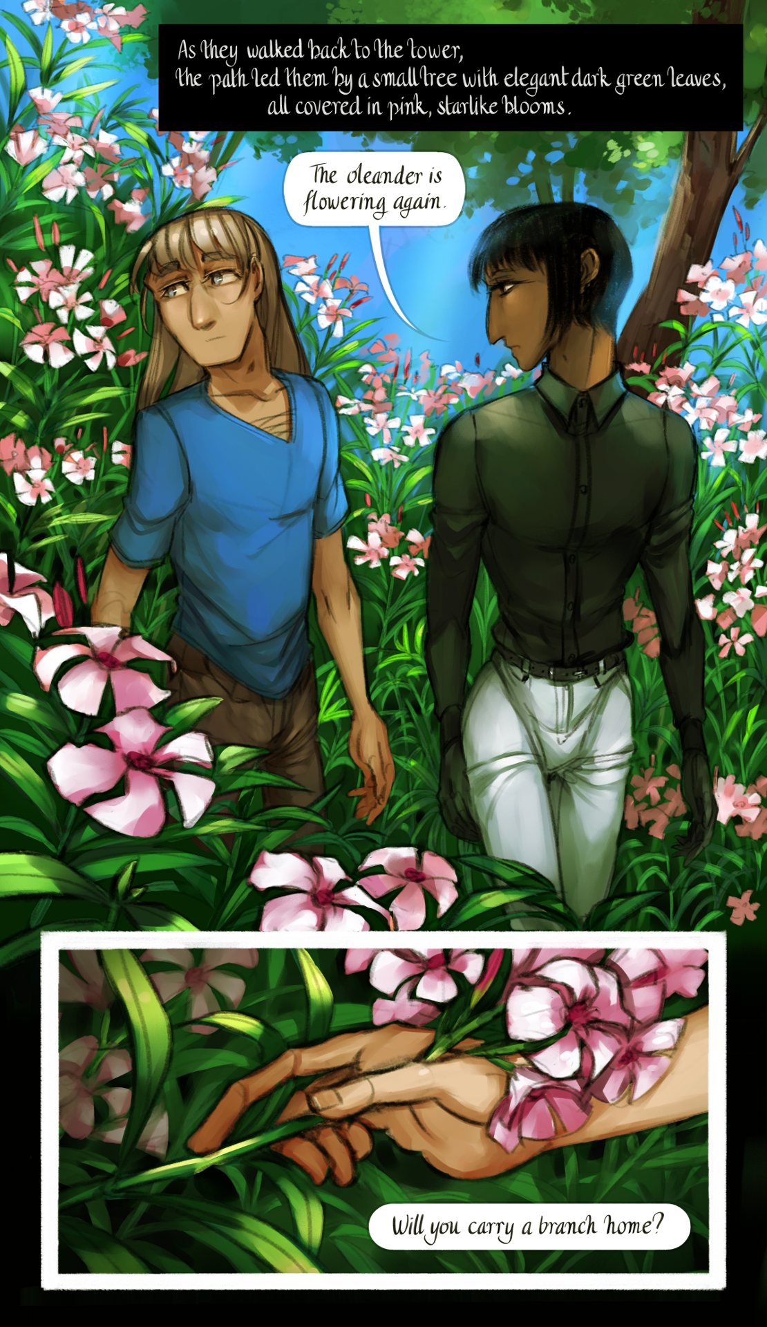 As they walked back to the tower, the path led them next to a small tree with elegant dark green leaves, all covered in pink, starlike blooms.