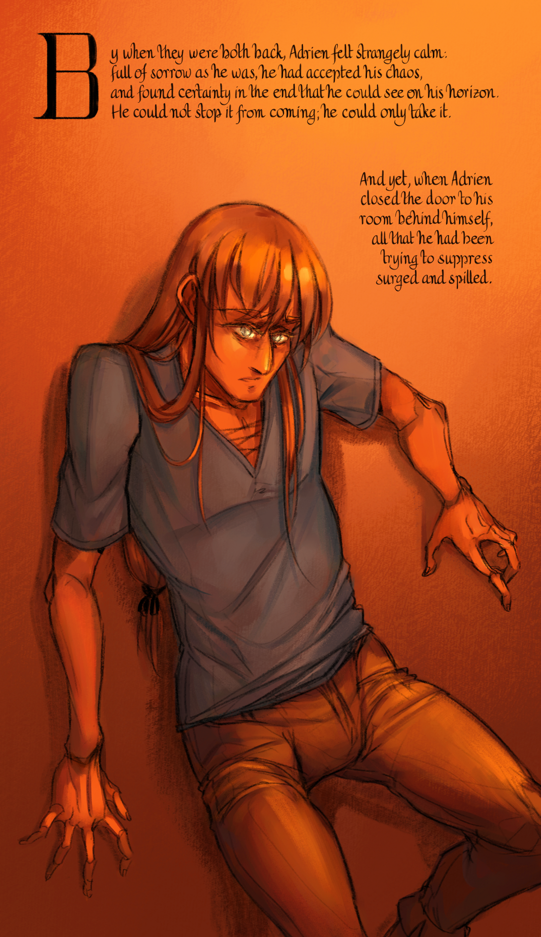 By when they were both back, Adrien felt strangely calm: full of sorrow as he was, he had accepted his chaos, and found certainty in the end that he could see on his horizon. He could not stop it from coming; he could only take it. And yet, when Adrien closed the door to his room behind himself, all that he had been trying to suppress surged and spilled.