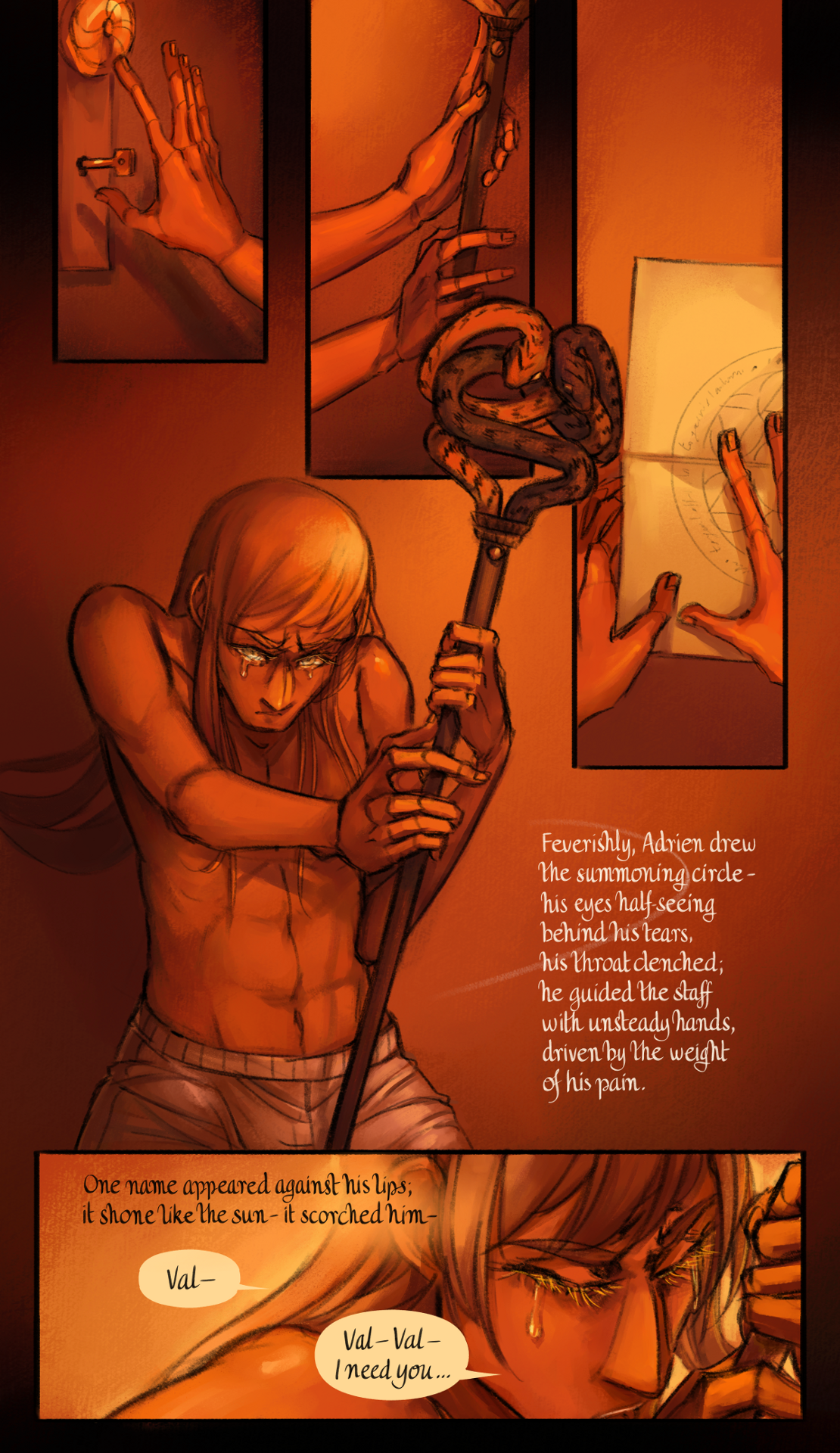 He locked the door to his room. He retrieved his staff from the corner where he kept it, and knew just what to do. He searched in a drawer for something - he had put it inside one of his books: the piece of paper bearing the design of the summoning circle that Val had given to him. Feverishly, Adrien drew the circle - his eyes half-seeing behind his tears, his throat clenched; he guided the staff with unsteady hands, driven by the weight of his pain. One name appeared against his lips; it shone like the sun - it scorched him; "Val", he cried, "Val -- Val -- I need you".