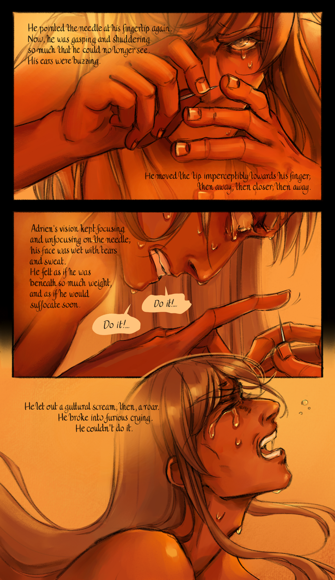 He pointed the needle at his fingertip again. Now, he was gasping and shuddering so much that he could no longer see. His ears were buzzing. He moved the tip imperceptibly towards his finger; then away; then closer; then away. Adrien's vision kept focusing and unfocusing on the needle; his face was wet with tears and sweat. He hissed. "Do it", he told himself. "Do it". He felt as if he was beneath so much weight, and as if he would suffocate soon.