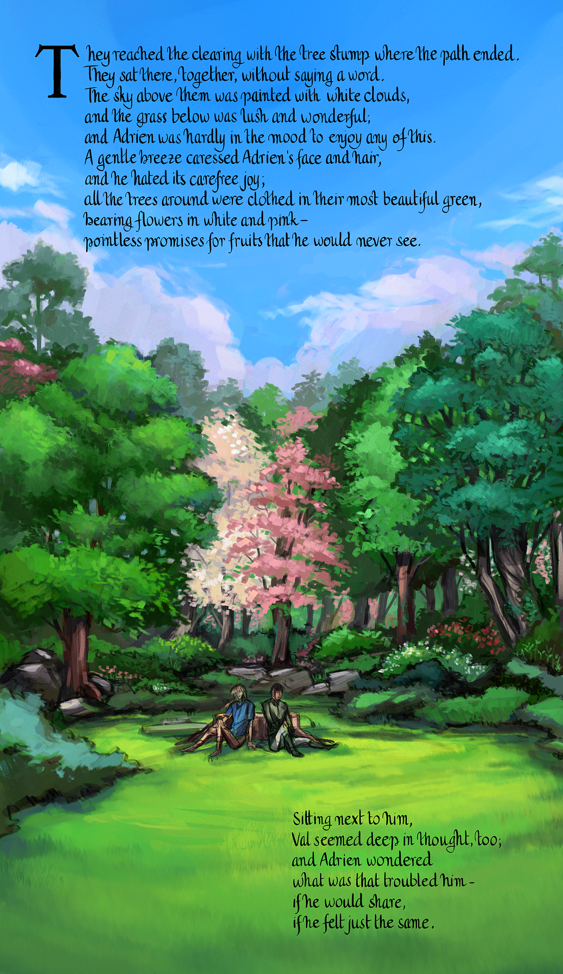 They reached the clearing with the tree stump where the path ended; Val took his bags off his shoulders, set them by the trunk, then sat himself down on the grass - and Adrien did the same. They sat there, together, without saying a word. The sky above them was painted with white clouds, and the grass below was lush and wonderful; and Adrien was hardly in the mood to enjoy any of this. A gentle breeze caressed Adrien's face and hair, and he hated its carefree joy; all the trees around were clothed in their most beautiful green, bearing flowers in white and pink - pointless promises for fruits that he would never see. Sitting next to him, Val seemed deep in thought, too; and Adrien wondered what was that troubled him - if he would share, if he felt just the same. They sat in silence for a long time; then, at last, Val turned towards him, and Adrien knew from the light of his eyes that the words that would follow came from deep within.