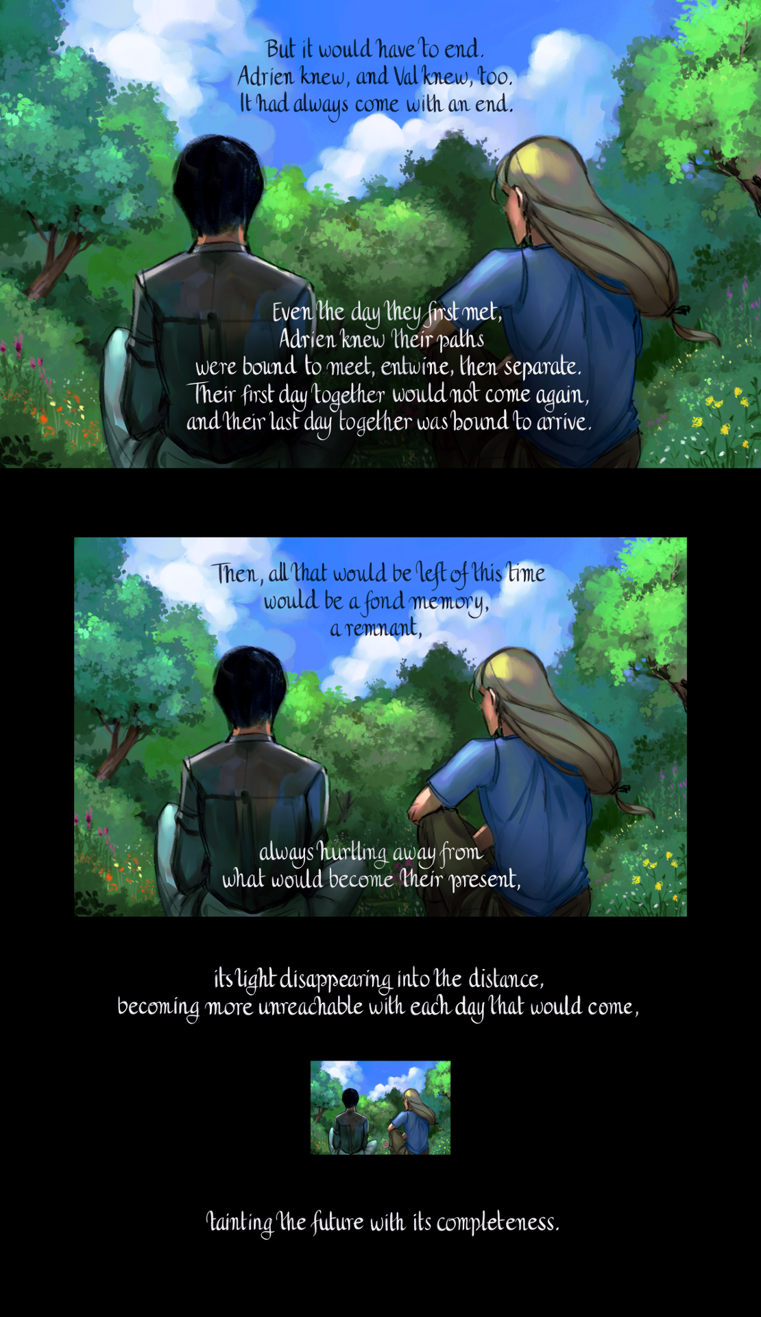 But it would have to end. Adrien knew, and Val knew, too. It had always come with an end. Even the day they first met, Adrien knew their paths were bound to meet, entwine, then separate. Their first day together would not come again, and their last day together was bound to arrive. Then, all that would be left of this time would be a fond memory, a remnant, always hurtling away from what would become his present, its light disappearing into the distance, becoming more unreachable with each day that would come, tainting the future with its completeness.