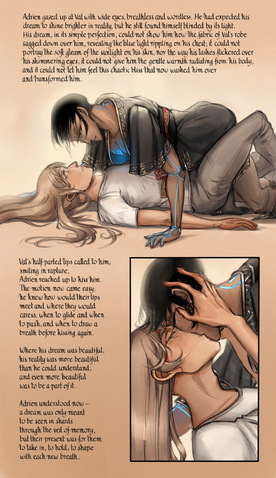 Adrien gazed up at Val with wide eyes, breathless and wordless. He had expected his dream to shine brighter in reality, but he still found himself blinded by its light. His dream, in its simple perfection, could not show him how the fabric of Val's robe sagged down over him, revealing the blue light rippling on his chest; it could not portray the soft gleam of the sunlight on his skin, nor the way his lashes flickered over his shimmering eyes; it could not give him the gentle warmth radiating from his body; and it could not let him feel this chaotic bliss that now washed him over and transformed him. Val's half-parted lips called to him; smiling in rapture, Adrien reached up to kiss him. The motion now came easy; he knew how would their lips meet and where they would caress, when to glide and when to push, and when to draw a breath before kissing again. Where his dream was beautiful, his reality was more beautiful than he could understand; and even more beautiful was to be a part of it. Adrien understood now - a dream was only meant to be seen in shards through the veil of memory, but their present was for them to take in, to hold, to shape with each new breath.