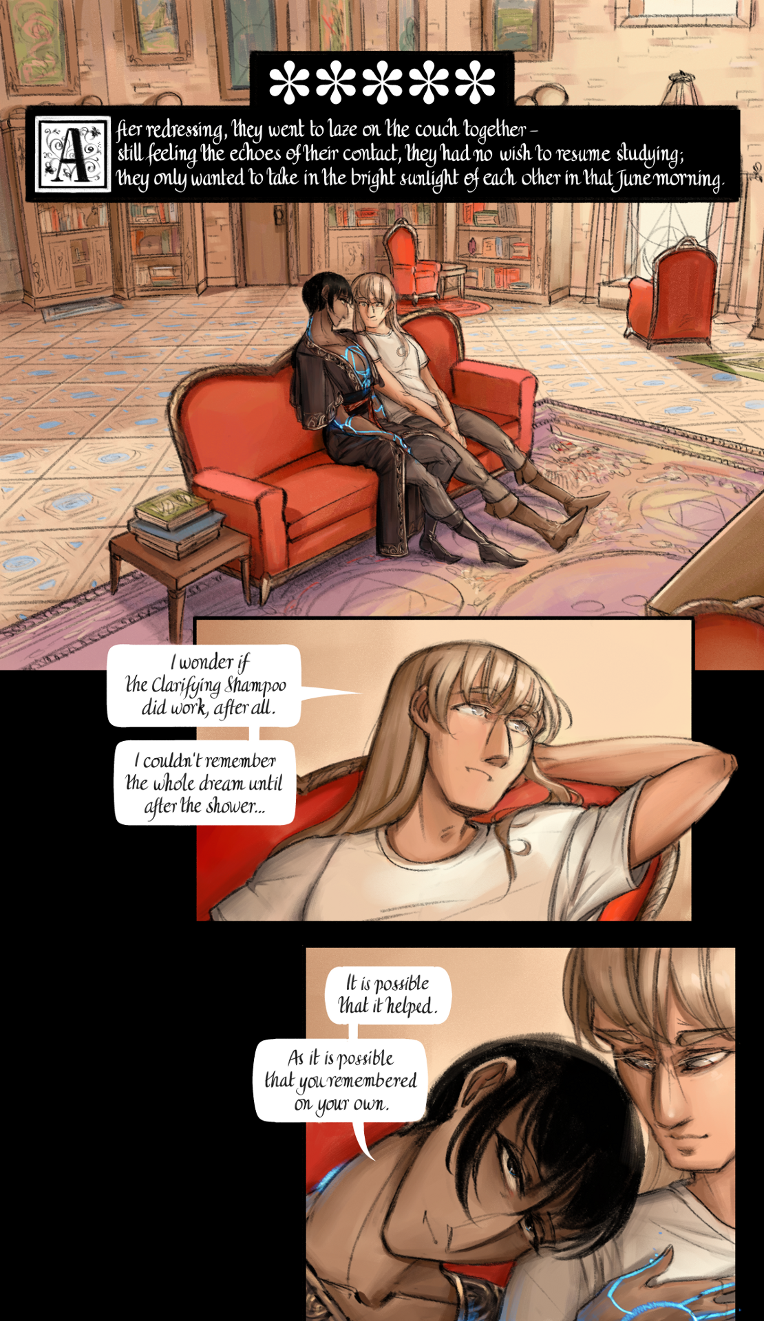 After redressing, they went to laze on the couch together - still feeling the echoes of their contact, they had no wish to resume studying; they wanted nothing more than to take in the bright sunlight of each other in that June morning.