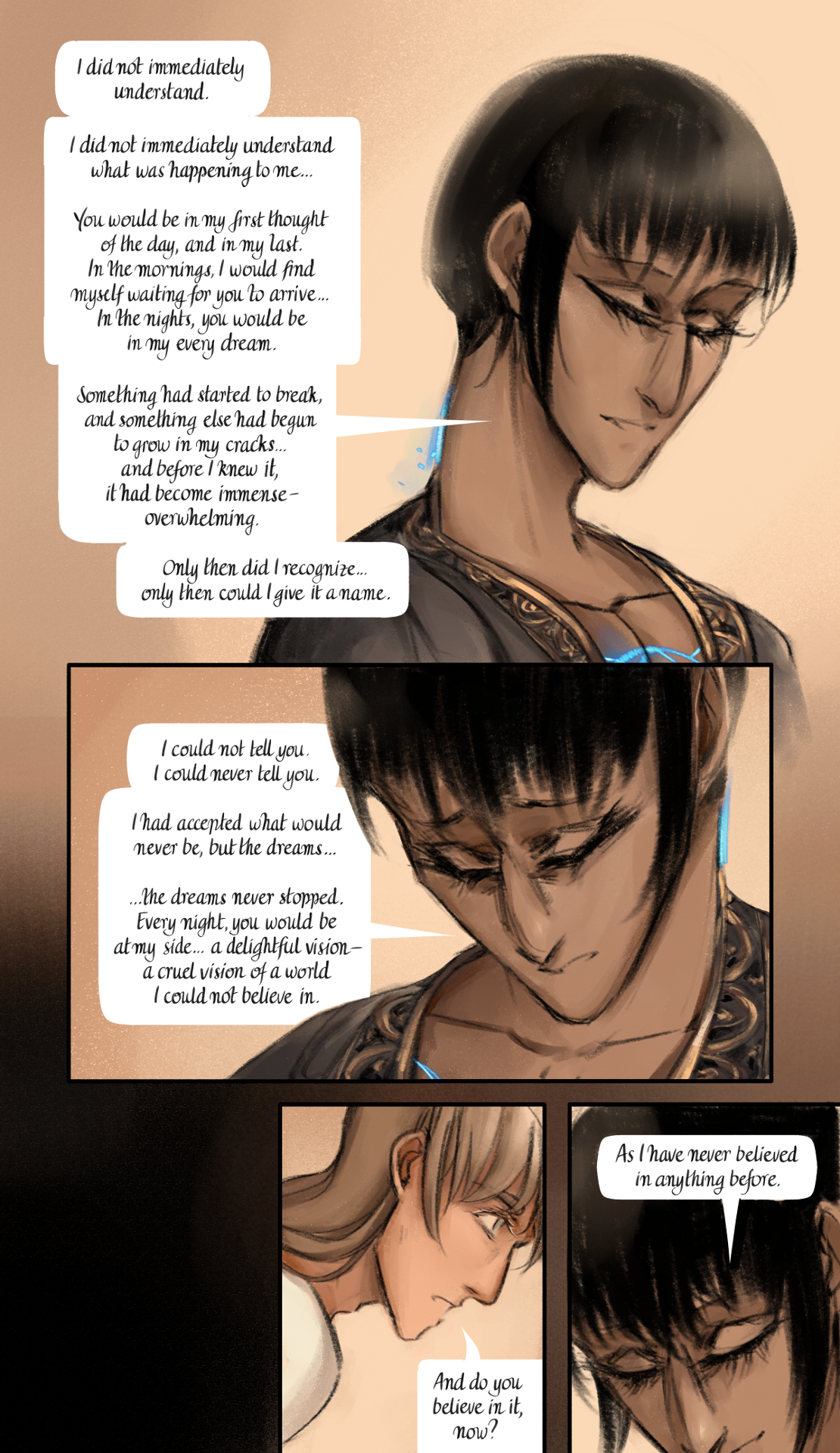 "I did not immediately understand", Val then said. "I did not immediately understand what was happening to me... You would be in my first thought of the day, and in my last. In the mornings, I would find myself waiting for you to arrive... In the nights, you would be in my every dream. Something had started to break, and something else had begun to grow in my cracks... and before I knew it, it had become immense - overwhelming. Only then did I recognize... only then could I give it a name". Val's throat moved as he swallowed; and Adrien knew it was to fight back tears - he had been doing just the same. "I could not tell you. I could never tell you. I had accepted what would never be, but the dreams... the dreams never stopped. Every night, you would be at my side... a delightful vision - a cruel vision of a world I could not believe in".
