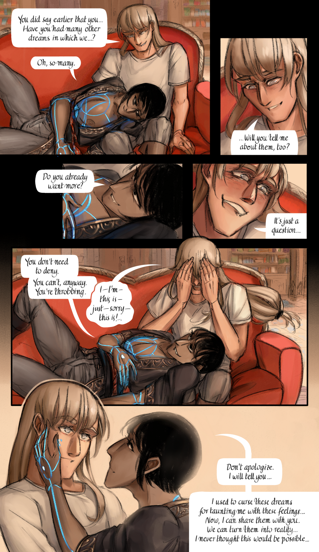Val laughed as well. "Don't apologize", he then said. "I will tell you...". He reached for Adrien's face with one hand; his fingers shimmered as they brushed over his cheek. "I used to curse these dreams for taunting me with these feelings... Now, I can share them with you. We can turn them into reality... I never thought this would be possible".