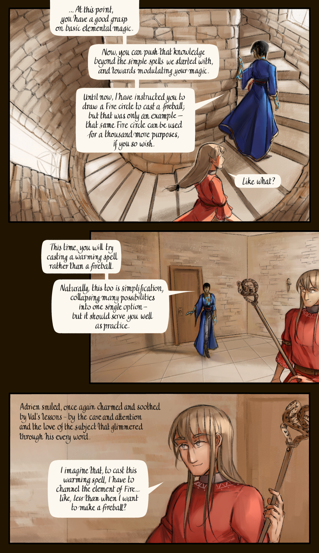 Adrien smiled, once again charmed and soothed by Val's lessons - by the care and attention and the love of the subject that glimmered through his every word. "I imagine that, to cast this warming spell, I have to channel the element of Fire... like, less than when I want to make a fireball?".