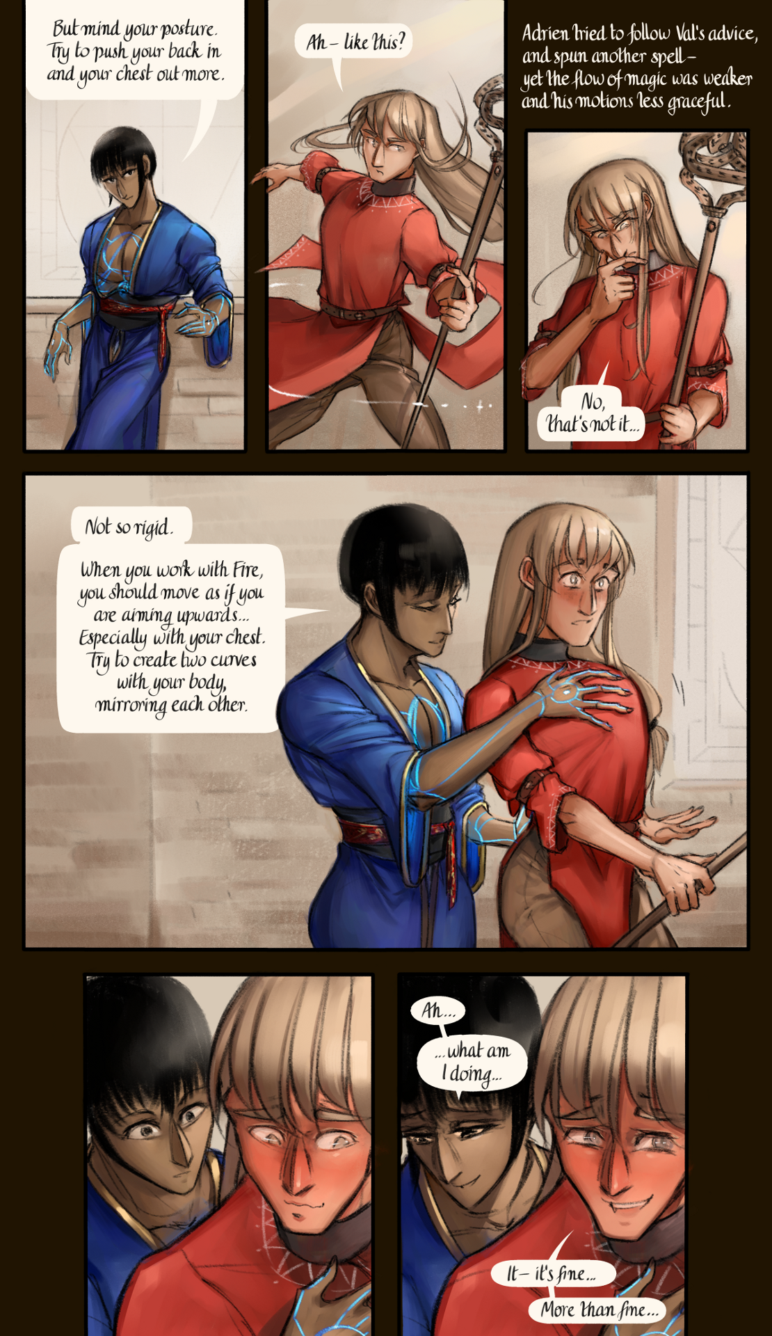 "Not so rigid", Val said, and he came to Adrien's side. "When you work with Fire, you should move as if you are aiming upwards... Especially with your chest. Try to create two curves with your body, mirroring each other". He gently pressed one hand against Adrien's lower back, pushing it upwards; he set his other hand on his chest, spreading his fingers to encourage him to take a deep breath. Adrien followed Val's guidance the best he could; but, as his chest expanded under Val's hand, all he could feel was the contact of his fingertips on him - and his own body's answer to that call. Val's gaze landed on Adrien's red face, so close to him; his eyes widened. "Ah...", he stammered, "...what am I doing...".
