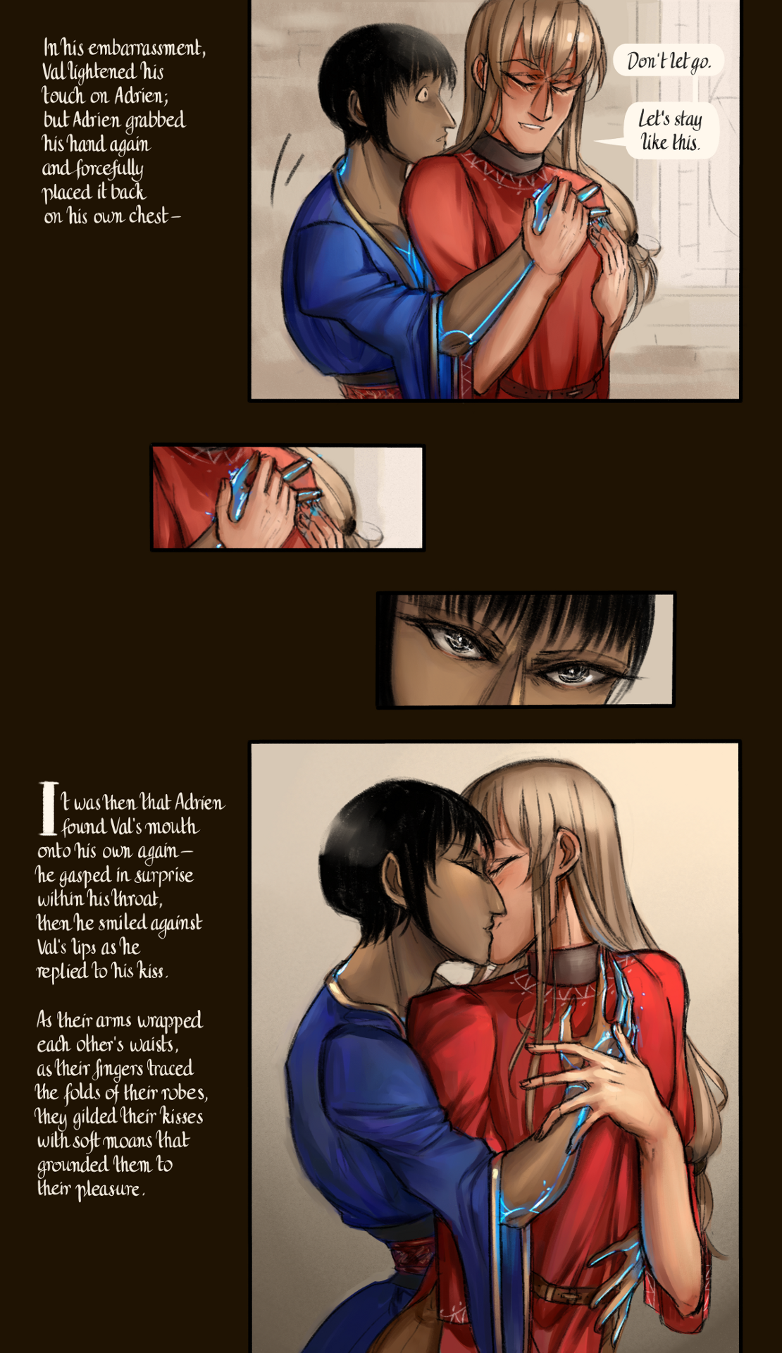 In his embarrassment, Val lightened his touch on Adrien; but Adrien grabbed his hand again, and forcefully placed it back on his own chest -- "Don't let go", he blurted out. "Let's stay like this". He curled his fingers onto Val's hand; his blue light shimmered faster. The enchanting darkness in Val's eyes seemed to ripple. It was then that Adrien found Val's mouth onto his own again - he gasped in surprise within his throat, then he smiled against Val's lips as he replied to his kiss. As their arms wrapped each other's waists, as their fingers traced the folds of their robes, they gilded their kisses with soft moans that grounded them to their pleasure.
