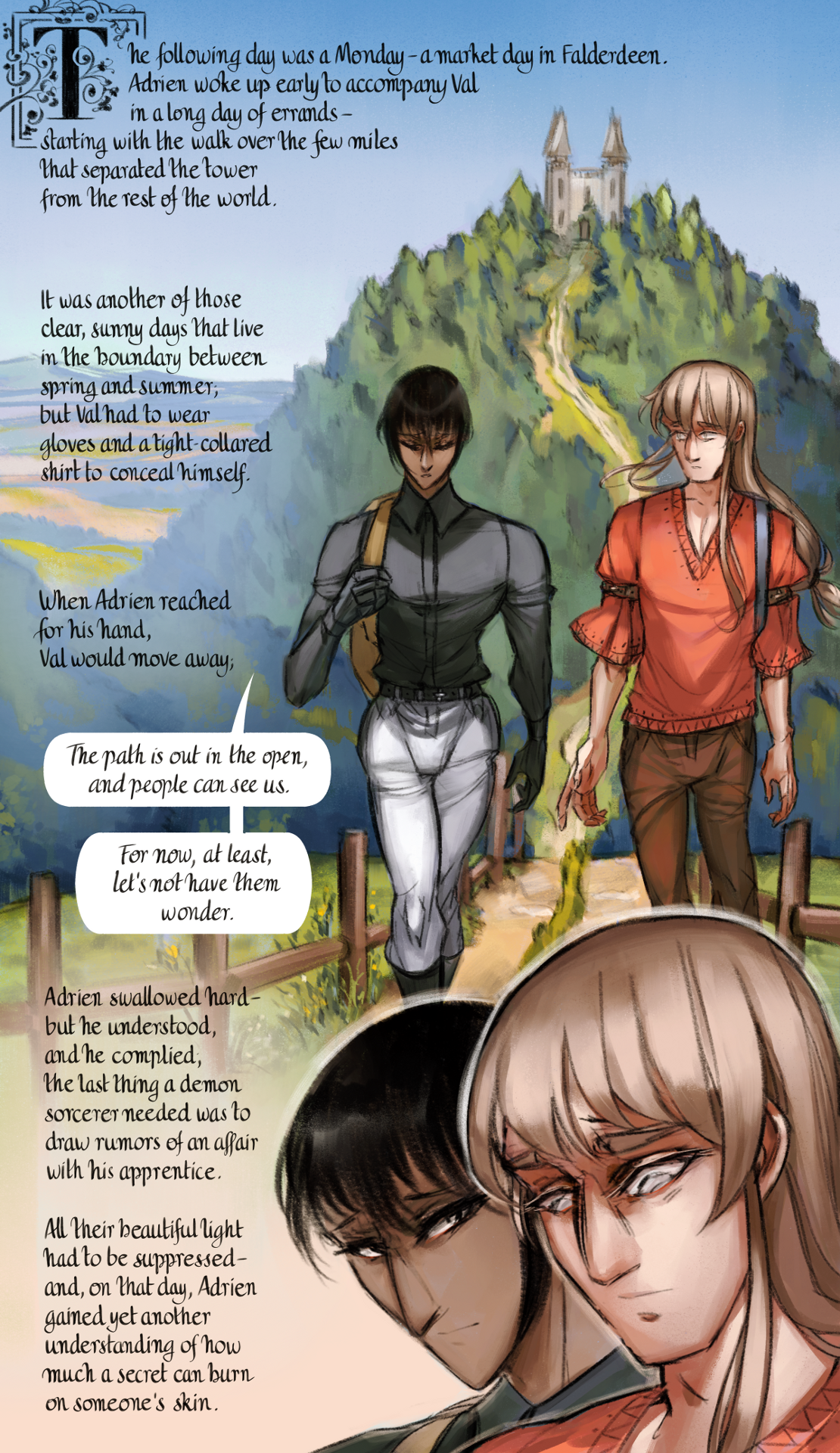 The following day was a Monday - a market day in Falderdeen. Adrien woke up early to accompany Val in a long day of errands - starting with the walk over the few miles that separated the tower from the rest of the world. It was another of those clear, sunny days that live in the boundary between spring and summer; but Val had to wear long gloves and a tight-collared shirt to conceal himself. When Adrien reached for his hand, Val would move away; "the path is out in the open, and people can see us", he had said. "For now, at least, let's not have them wonder". Adrien swallowed hard - but he understood, and he complied; the last thing a demon sorcerer needed was to draw rumors of an affair with his apprentice. All their beautiful light had to be suppressed - and, on that day, Adrien gained yet another understanding of how much a secret can burn on someone's skin.