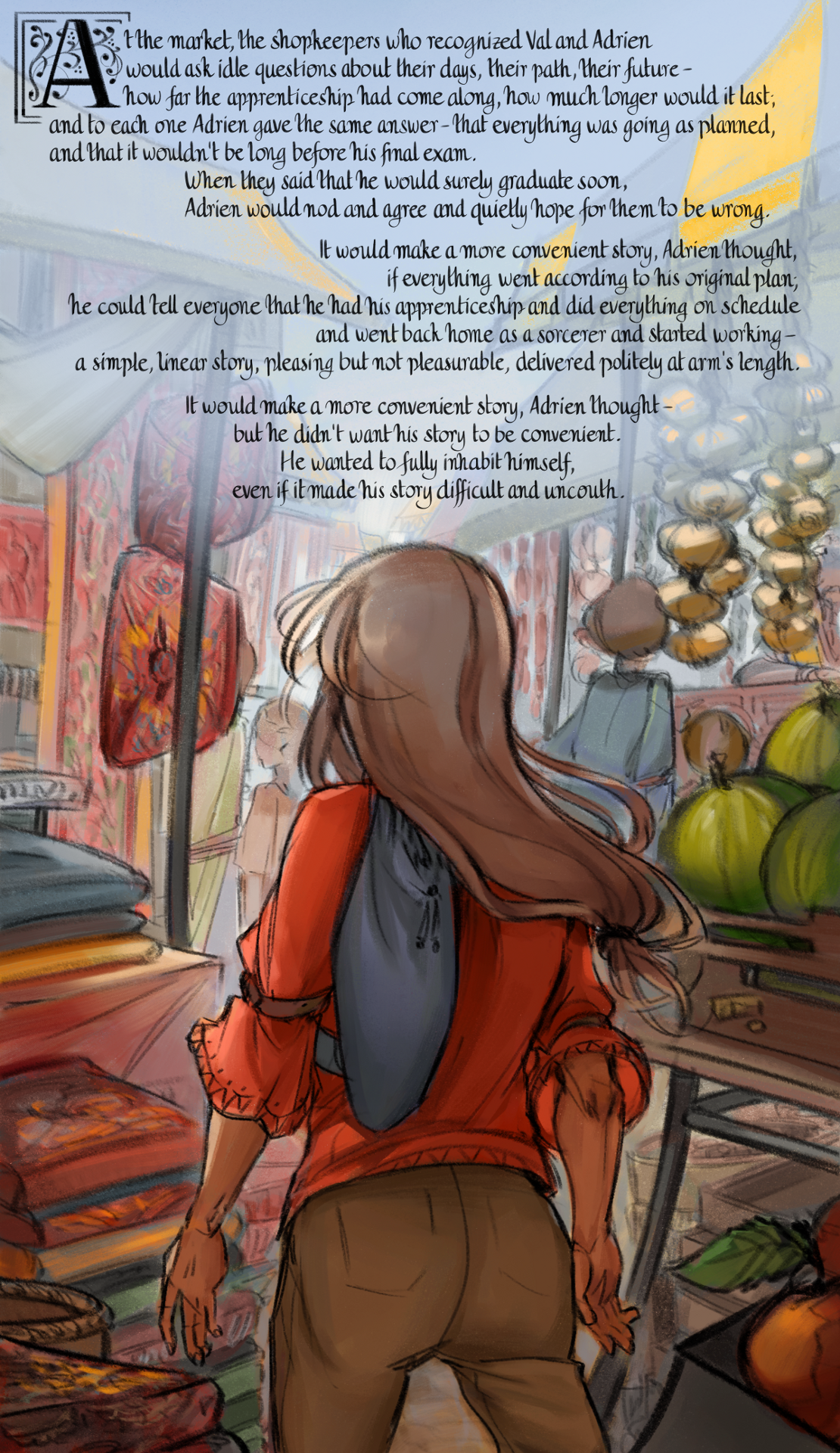 At the market, the shopkeepers who recognized Val and Adrien would ask idle questions about their days, their path, their future - how far the apprenticeship had come along, how much longer would it last; and to each one Adrien gave the same answer - that everything was going as planned, and that it wouldn't be long before his final exam. When they said that he would surely graduate soon, Adrien would nod and agree and quietly hope for them to be wrong. It would make a more convenient story, Adrien thought, if everything went according to his original plan; he could tell everyone that he had his apprenticeship and did everything on schedule and went back home as a sorcerer and started working - a simple, linear story, pleasing but not pleasurable, delivered politely at arm's length. It would make a more convenient story, Adrien thought - but he didn't want his story to be convenient. He wanted to fully inhabit himself, even if it made his story difficult and uncouth.